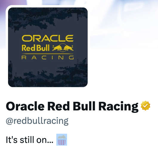 红牛车队官推的简介改成了:It's still on...🍿 (还未结束)