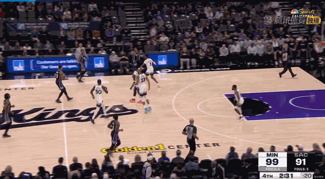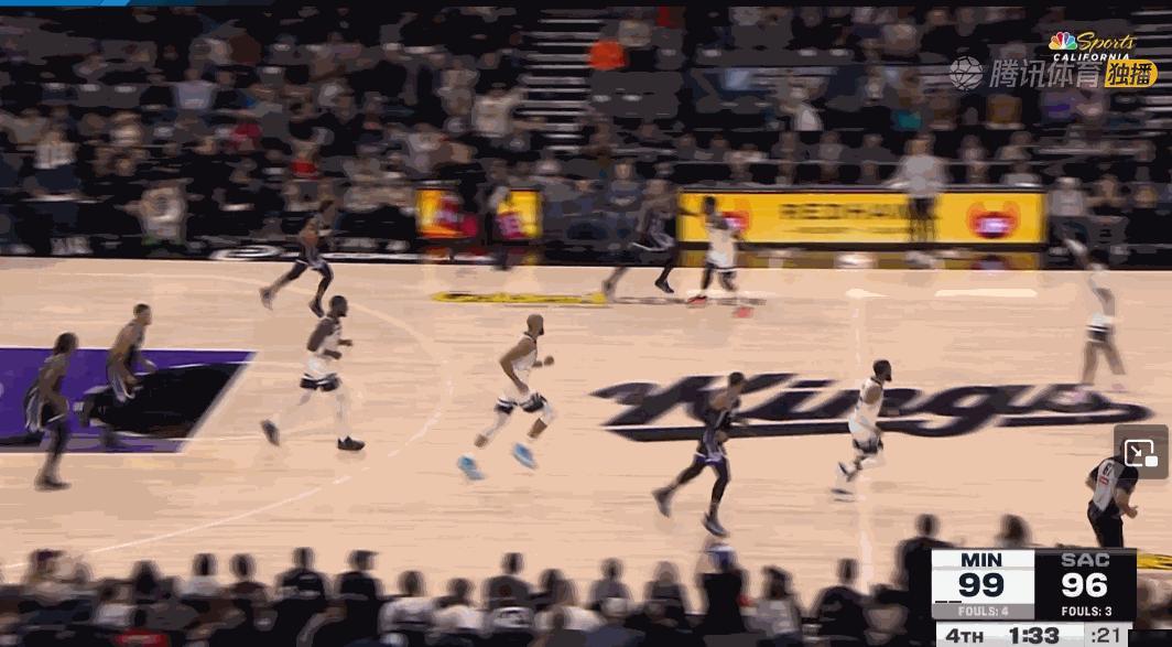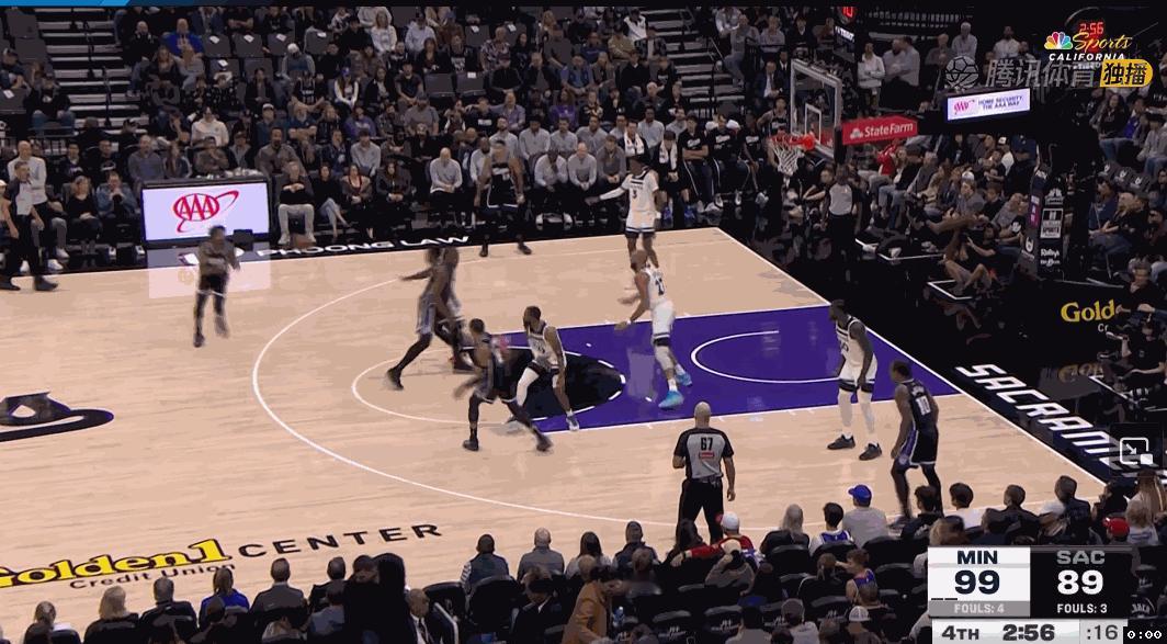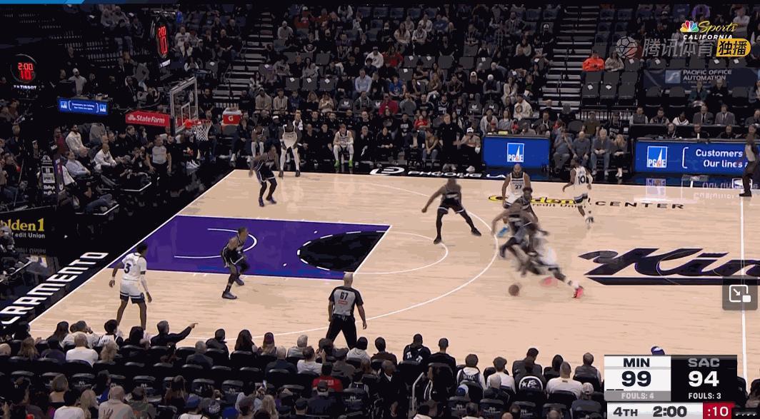 第四节比赛结束前3分钟,华子打成2+1,森林狼领先10分。随后国王只用了一分半,4次进攻打平。图1蒙克接少爷传球定点突破,个人硬实力;图2康利积极换防,但换防后根本防不了德罗赞,逼得兰德尔上协防,漏给外线定点三分机会;图3少爷上球厉害,蒙克轻松得分;图4德罗赞打转换,攻了一个立足未稳。杰登单防有问题,戈贝尔协防也搞不定,还赔上2+1。森林狼连续打铁,国王轻轻松松就扳平了。