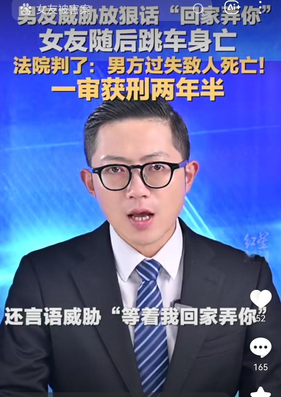 青海的李某和女友安某吵架互殴后,从派出所出来,安某不愿跟李某走,却被强行推上车还反锁车门。车上李某一句“等着我回家弄你”,直接把安某逼上绝路,最终跳车身亡。 法院以过失致人死亡罪判李某两年半刑期和6万赔偿,这判决引发争议。有人觉得判轻了,一条人命就换两年半;也有人疑惑,是安某自己跳车,为啥要判刑。其实,李某明知安某有自杀自残行为,还威胁她,加速行驶也不停车,他有不可推卸的责任。 A网友:就过失致死啊?还有暴力控制人身自由,严重威胁恐吓,人身伤害,数罪并罚,起码8年以上的。 B网友:我也是服了,那些打女人的男人,连最基本的做人原则都没有。我是男的,我都赞成要离打女人的男的越远越好,只有0次和无数次。 C网友:强行推进车内算不算非法限制人身自由致人死亡?有跳车的勇气居然没有分手的勇气,可叹! D网友:让我想起了那个河北石家庄女子曹某某因长期遭受家暴,在驾车逃离过程中导致丈夫刘某某死亡,一审被判故意杀人罪有期徒刑11年的案子,两个一对比,总感觉有哪里不对劲。 这也提醒大家,家暴不只是动手,语言威胁、强行控制都是暴力。恋爱中遇到矛盾,一定要好好沟通,别让一时冲动酿成大错。希望大家在亲密关系里多些尊重和理解,别让悲剧再发生。