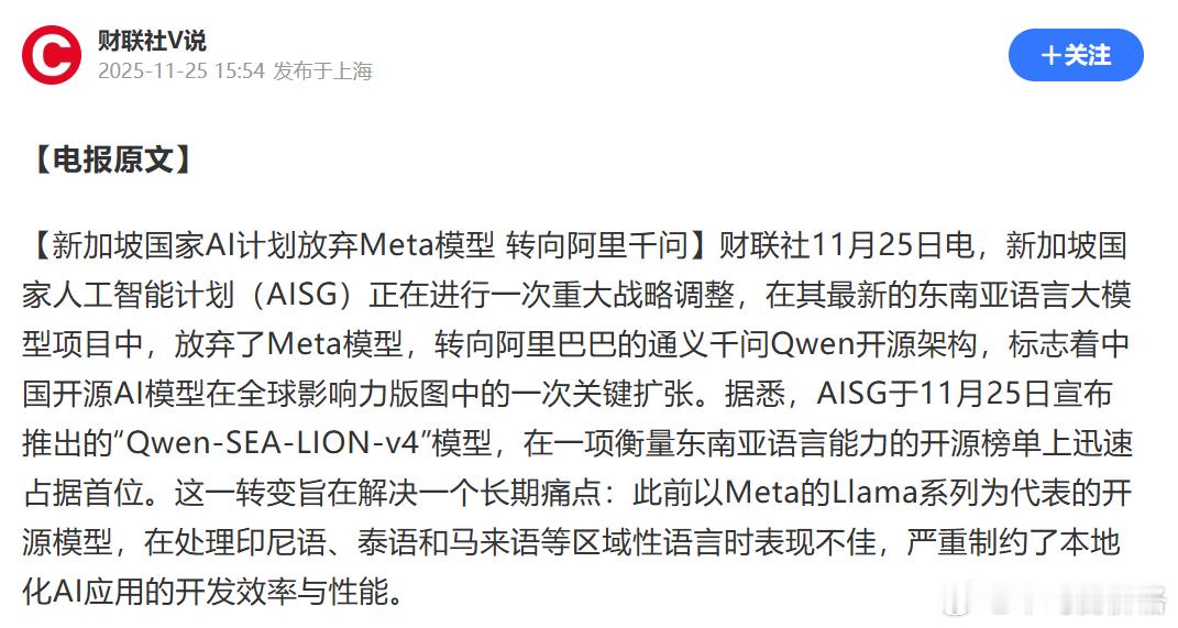 财联社:新加坡国家人工智能计划(AISG)放弃了Meta模型,转向阿里巴巴的通义千问Qwen开源架构!