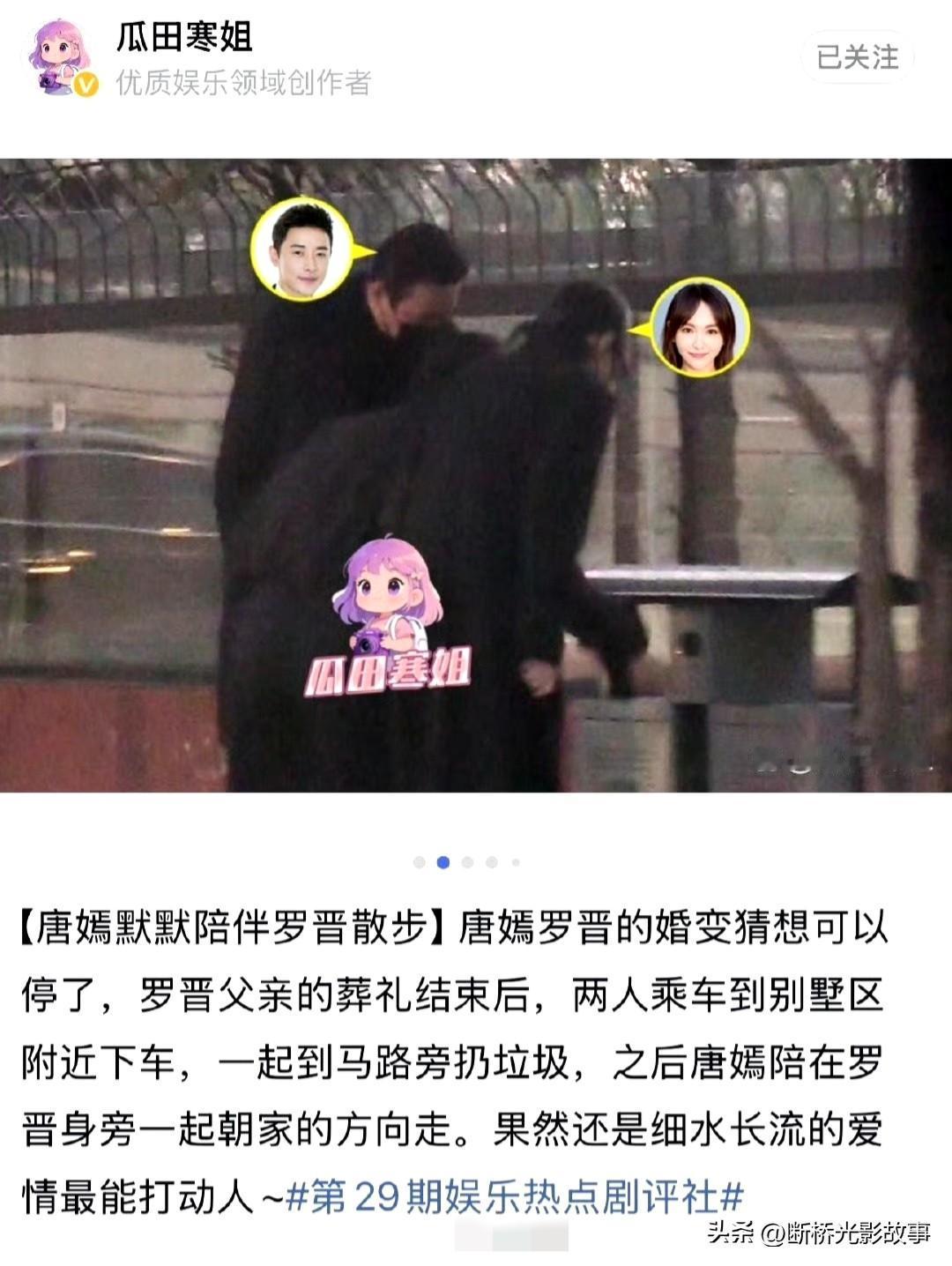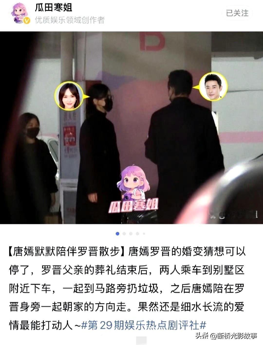 唐嫣罗晋“婚变”破防:葬礼后同框,细节里全是温柔 罗晋父亲葬礼后,唐嫣全程陪在身边——两人乘车到别墅附近,一起扔垃圾、并肩走回家的画面,让“婚变”传闻不攻自破。 没有刻意秀恩爱,只是在情绪低落时的默默陪伴:黑衣同框的默契、并肩前行的松弛,都是细水长流的佐证。 从公开到如今,他们的感情从不是轰轰烈烈,却藏在每个需要彼此的时刻里。