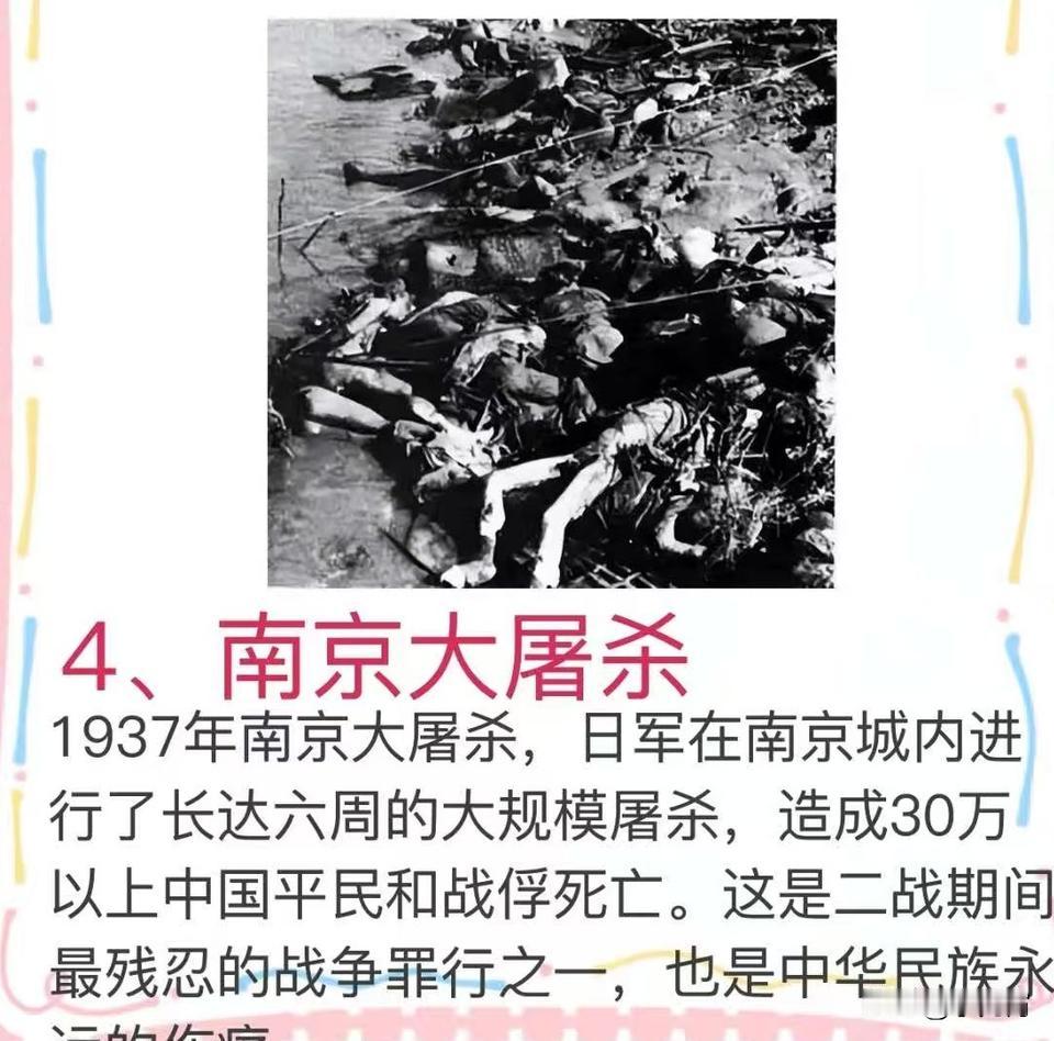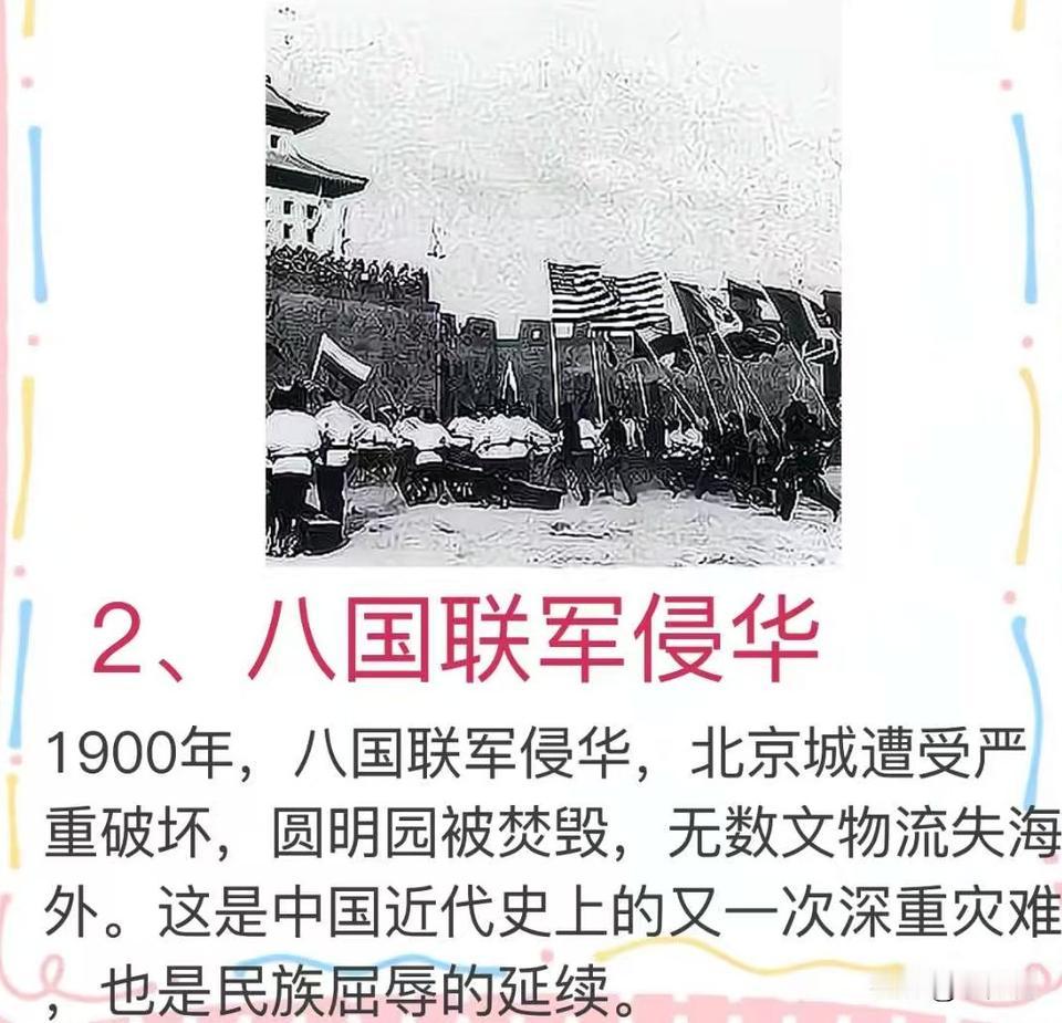 从1894年的甲午战争到1945年的抗战胜利,藏着中华民族最痛的伤疤,也烧着最烈的血性:这5个历史瞬间,每个中国人都该刻在骨子里! 1、甲午战争 1894年甲午战争爆发,标志着中国近代史上的一次重大国耻。这场战争不仅导致了清朝的进一步衰弱,也使得中国失去了台湾等重要领土,成为民族屈辱的开始。 2、八国联军侵华 1900年,八国联军侵华,北京城遭受严重破坏,圆明园被焚毁,无数文物流失海外。这是中国近代史上的又一次深重灾难,也是民族屈辱的延续。 3、九一八事变 1931年九一八事变爆发,日本侵略者占领东北三省,开始了对中国的全面侵略。这一事件是中国抗日战争的起点,也是中华民族面临生死存亡的严峻考验。 4、南京大屠杀 1937年南京大屠杀,日军在南京城内进行了长达六周的大规模屠杀,造成30万以上中国平民和战俘死亡。这是二战期间最残忍的战争罪行之一,也是中华民族永远的伤痛。 5、抗日战争胜利 1945年抗日战争胜利,中国军民经过八年艰苦卓绝的斗争,最终赢得了抗日战争的伟大胜利。这是中华民族反抗外来侵略的一次伟大胜利,也是中国近代史上的一次重大转折。 只有自己的力量足够强大的时候,别人才不敢欺负你,当时就是我们的清政府软弱无能,才签订这些不平等的条约,割地赔款,百年过去了,该是我们中华民族扬眉吐气的时候了,该是西方列国看我们脸色行事的时候了……