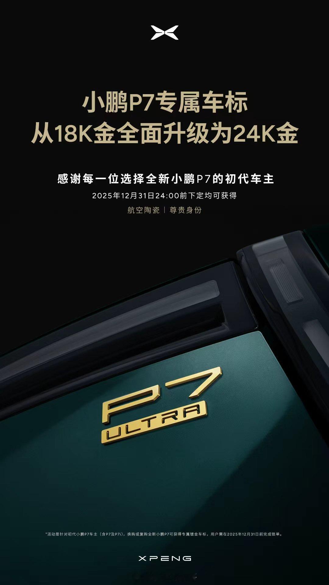 小鹏宠粉升级!P7专属车标18K金免费换24K金,含金量再涨。何小鹏回应初代车主