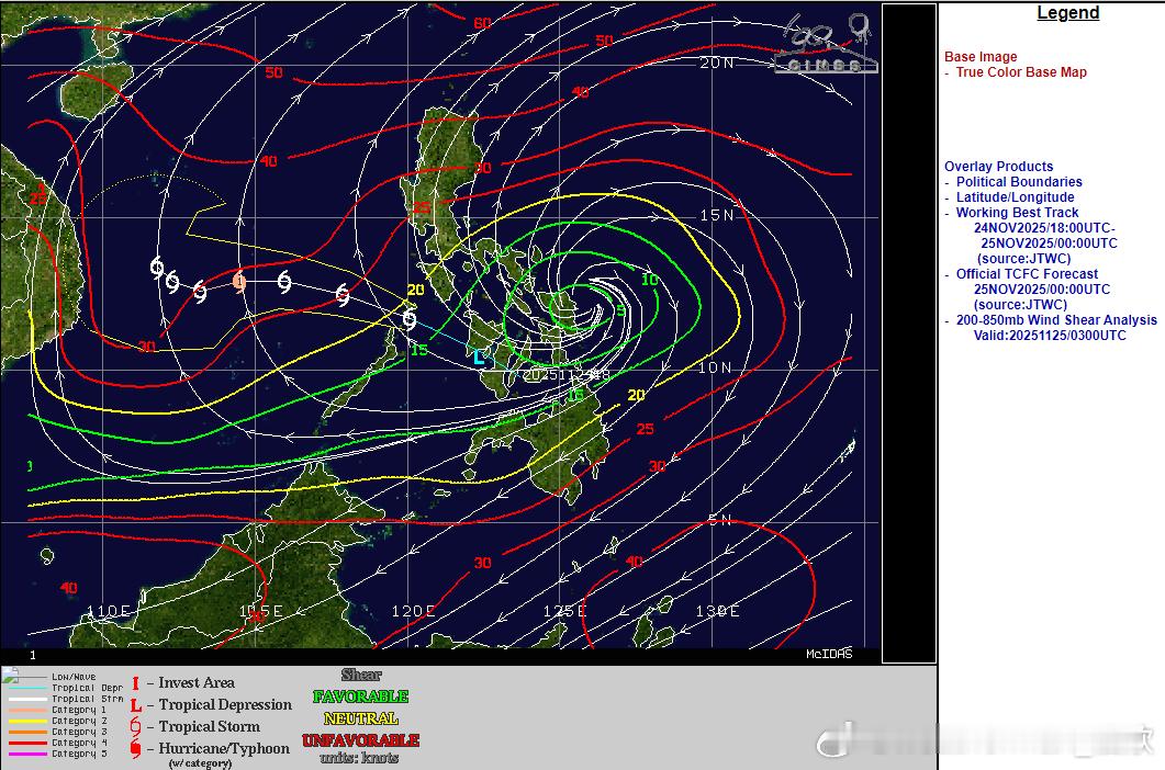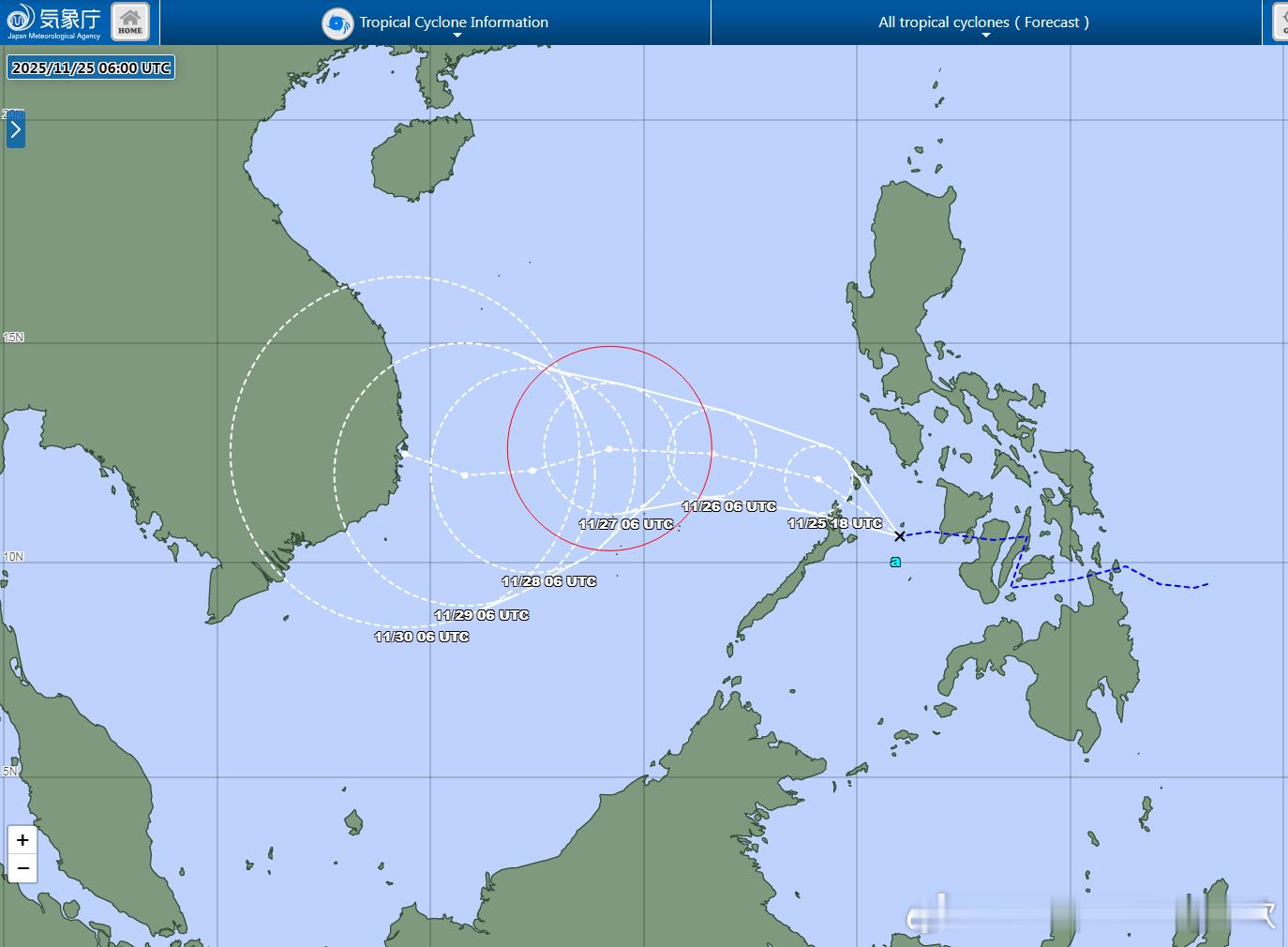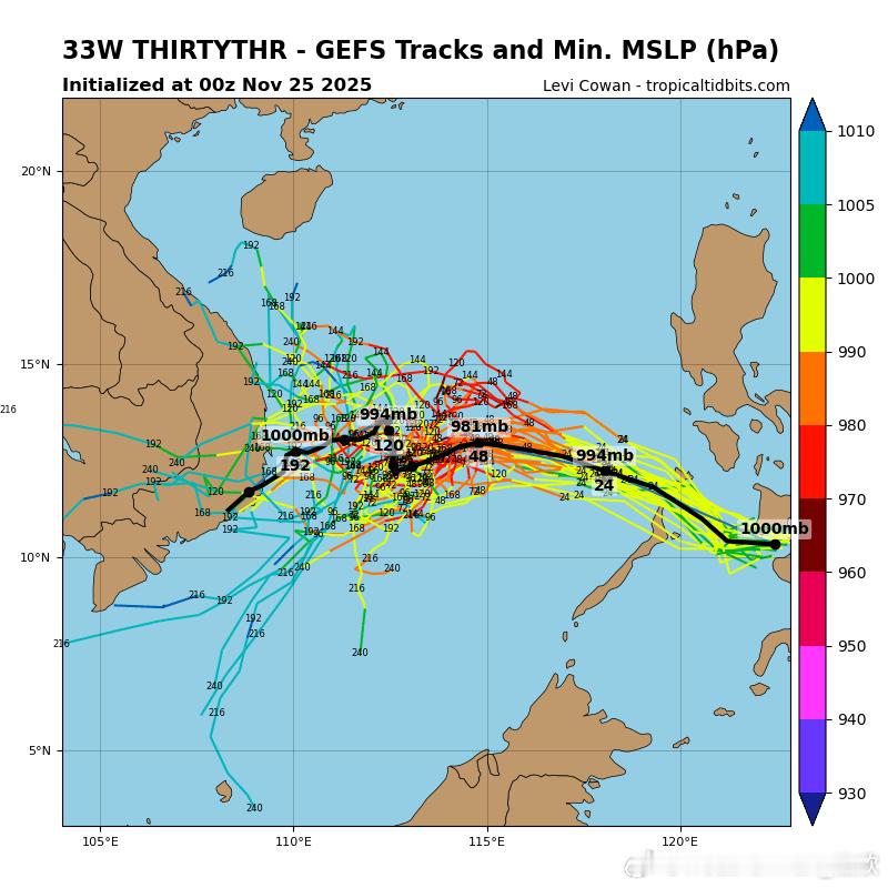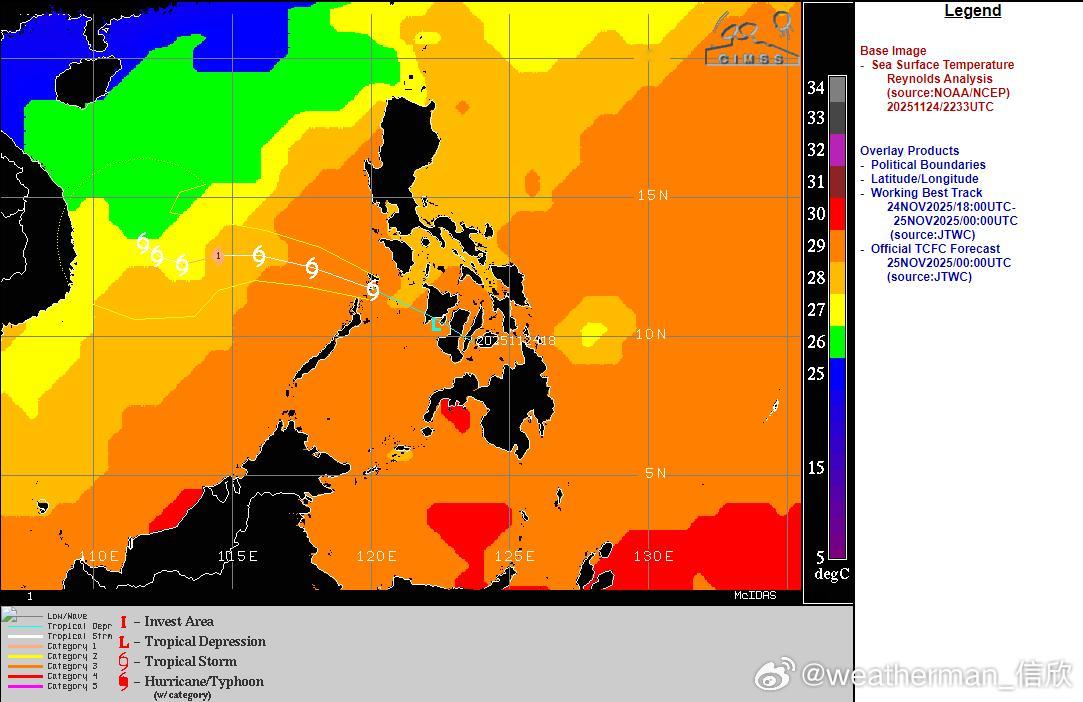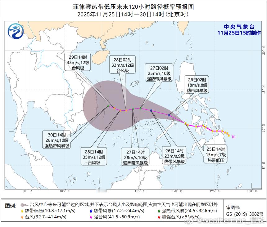 今天热带低压穿过菲律宾群岛,下午低压中心处于苏禄海。未来将继续西行,强度逐渐增强,最快今晚,最迟明天将获得编号升级,成为27号台风天琴。今夜-明晨进入南海后,南海东部的海温还有28-29℃,垂直风切变弱,总体环境条件利于继续增强,最强可达强热带风暴-台风级。之后继续西行,南海西部的海温下降,垂直风切变加大,在靠近越南的过程中,可能就会减弱,甚至未登陆越南就消散了。