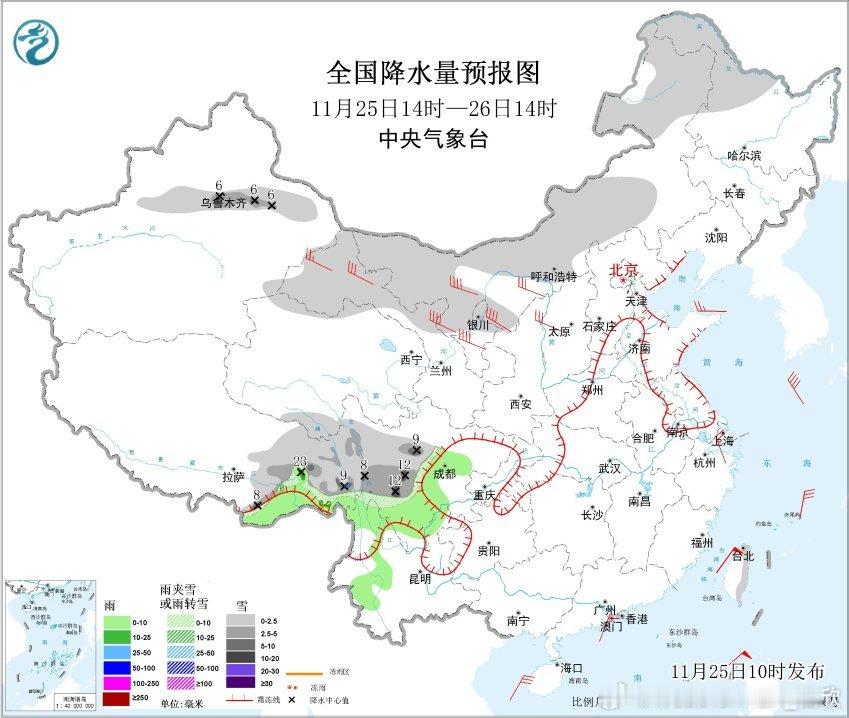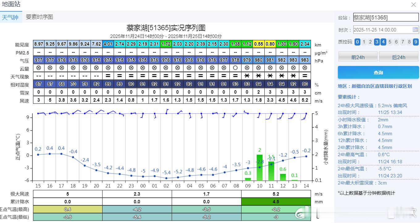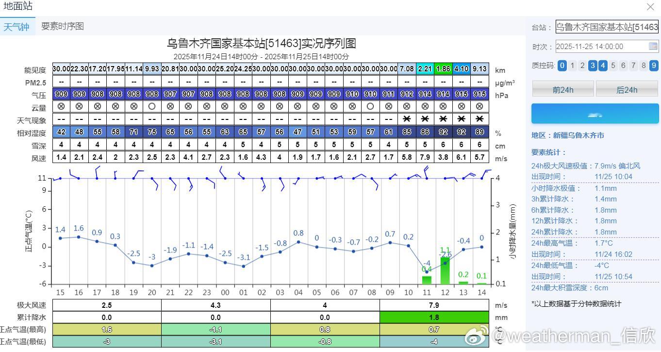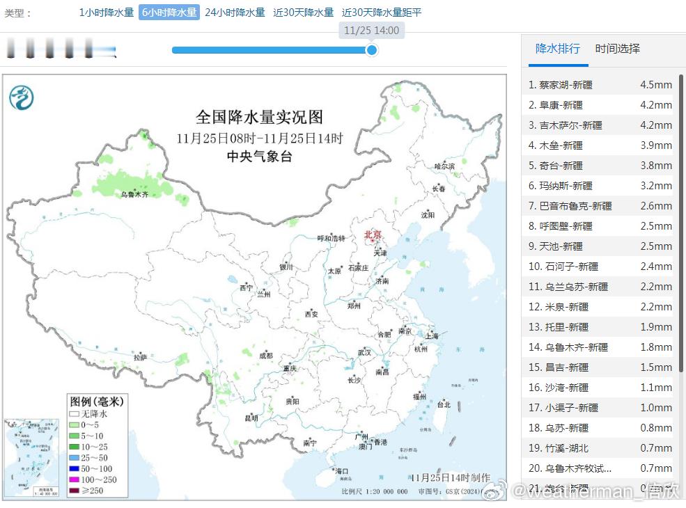 【降雪】今天08-14时,6小时降水榜被新疆站点包揽了前18。因为冷空气影响,新疆北部出现降雪。蔡家湖4.5毫米,最强,14时积雪3厘米。乌鲁木齐老国家站(51463站),1.8毫米降雪量,14时积雪增厚到6厘米(之前有4厘米)。今天下午到明天中午,天山沿线还有明显降雪。明天降雪还会向内蒙古推进。