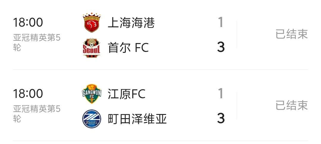 18点同时举行的两场亚冠比分竟然全部是1:3,上海海港主场1:3不敌首尔,江源主场1:3不敌町田!