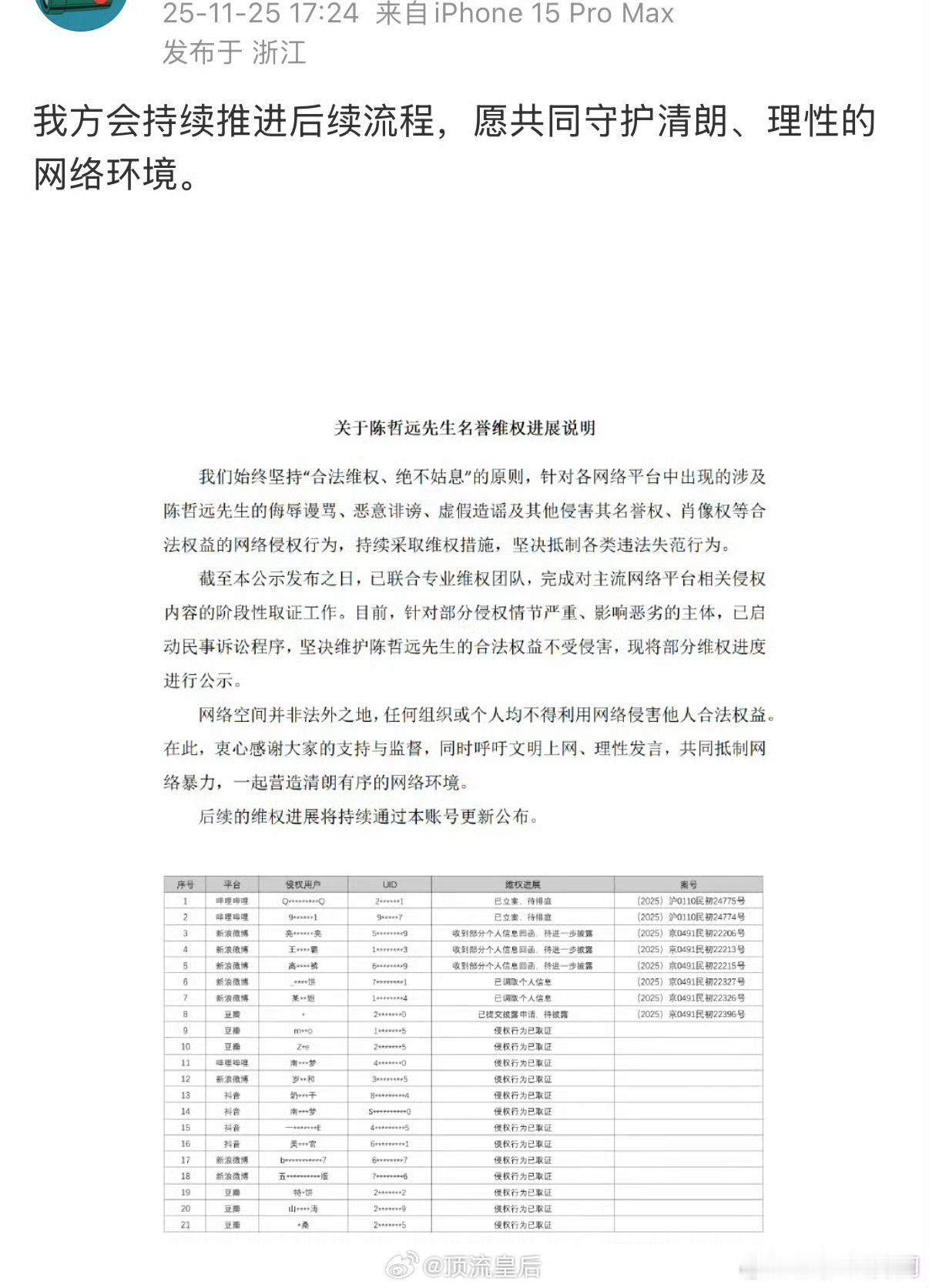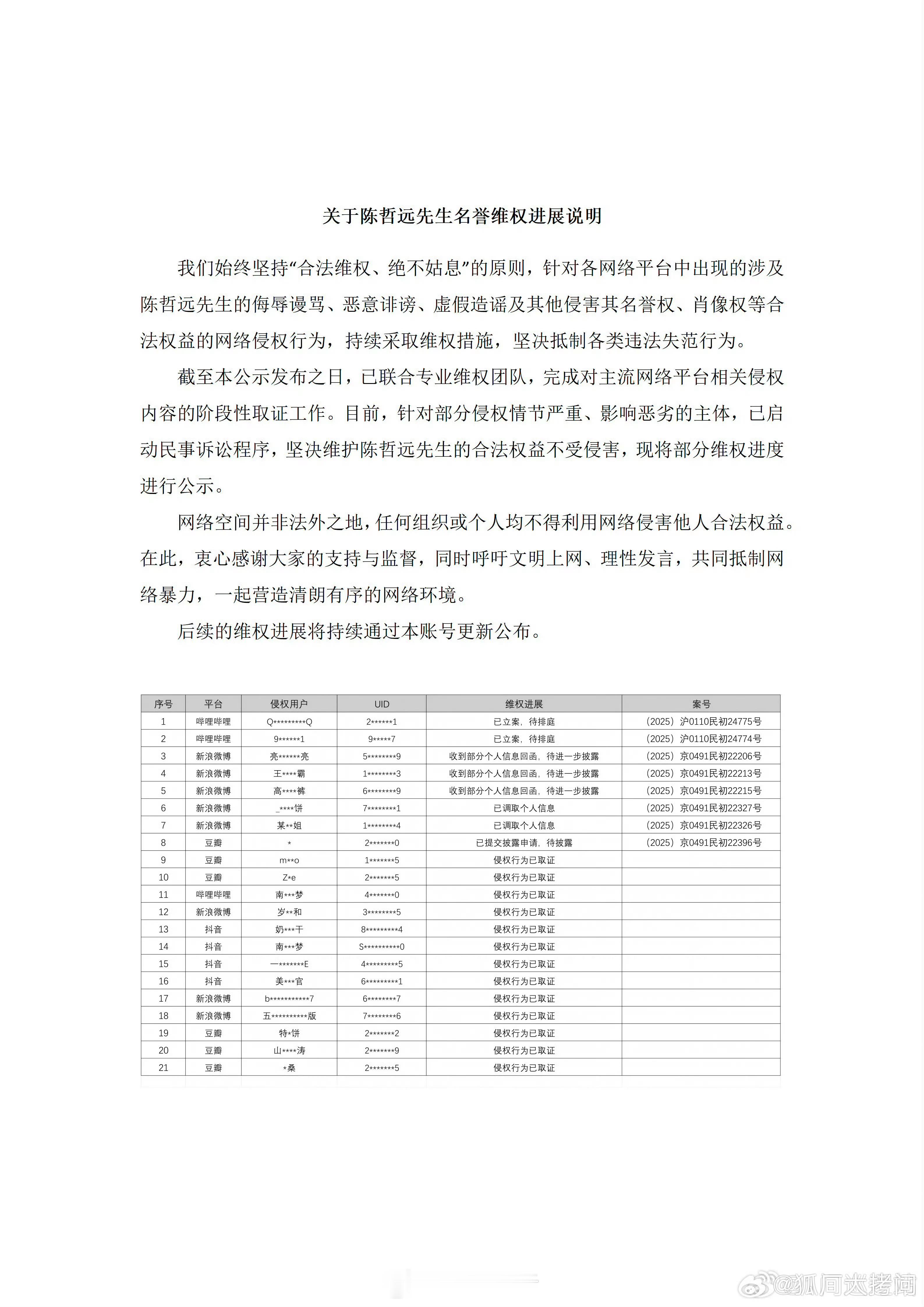 陈哲远方公布最新维权进展了,真的很体面了,遭遇这么多网暴,戏拍完杀青了才开始维权。
