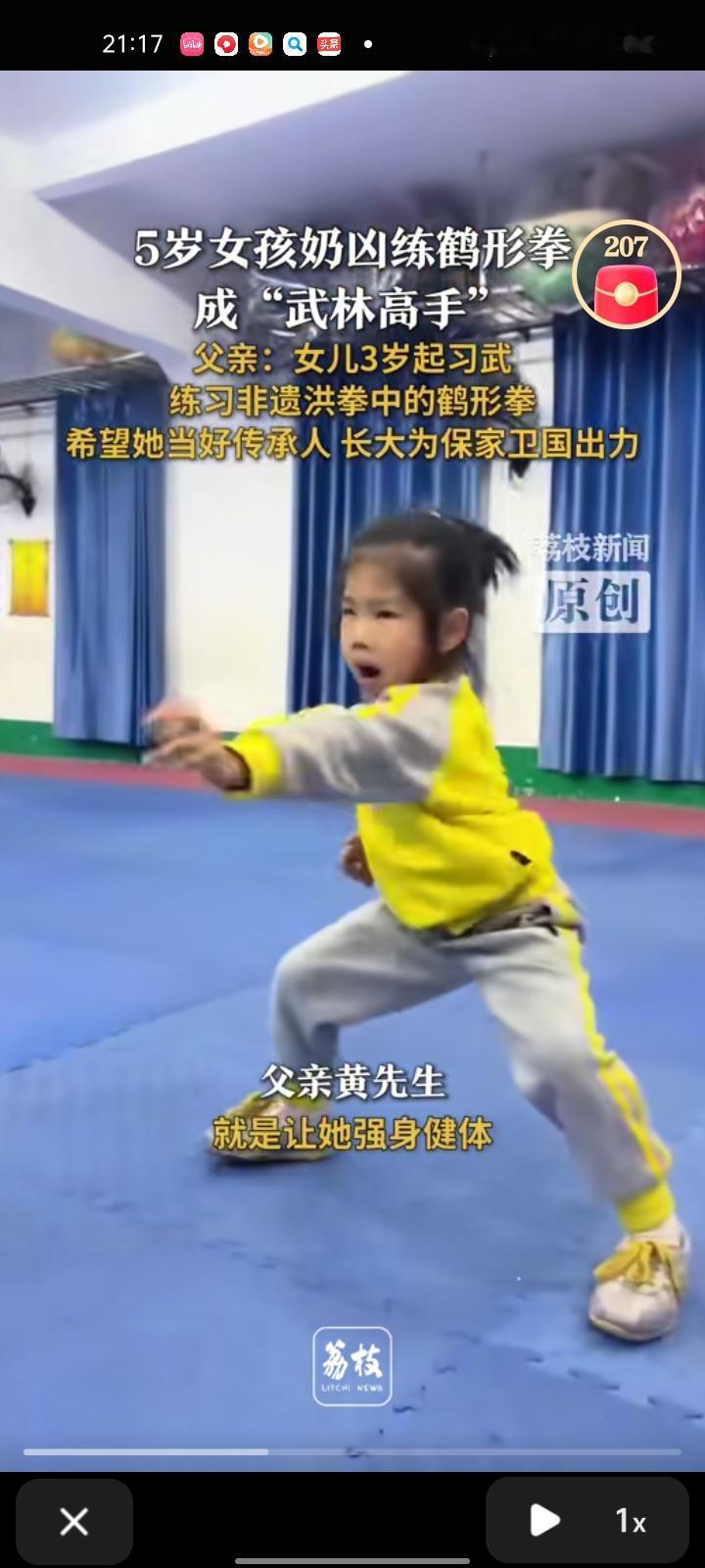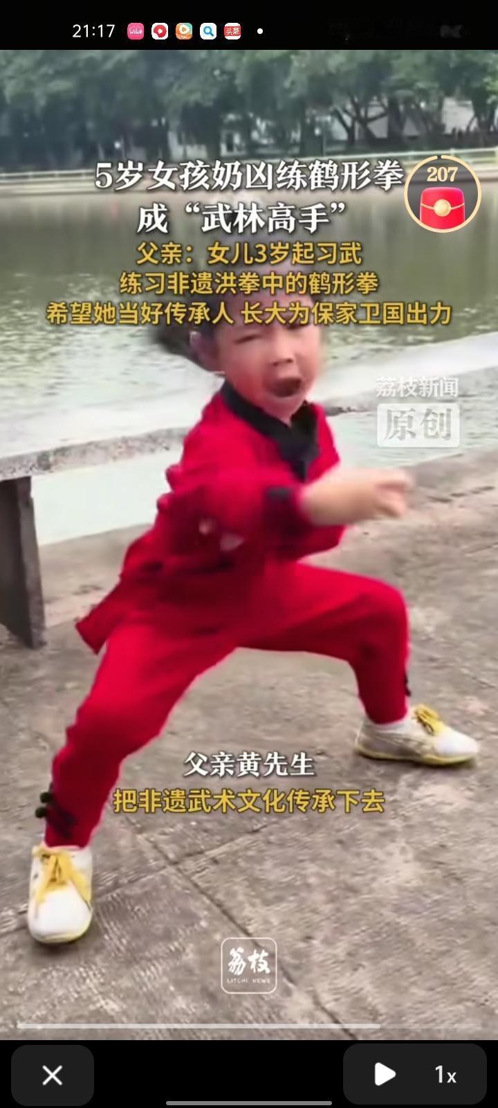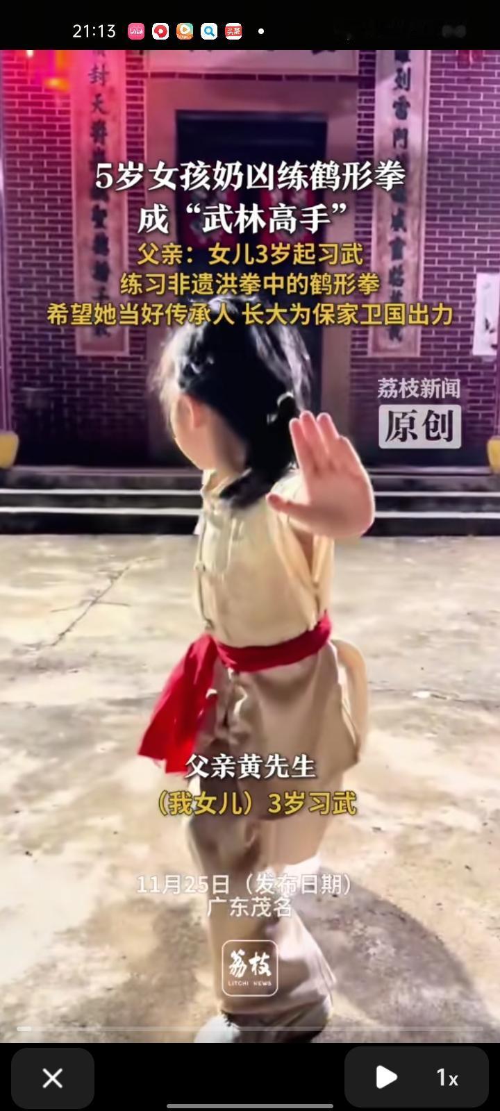 11月25日(发布),广东茂名。五岁女童奶凶练鹤形拳,成为“武林高手”。孩子爸爸黄先生介绍,女儿三岁起习武,练的是省级非遗茂南红拳中的鹤形拳。当初从小让她练习武术,就是让她强身健体,学会自保,也希望她在日复一日的练习里读懂非遗武术底蕴,当好茂南红拳的小小传承人