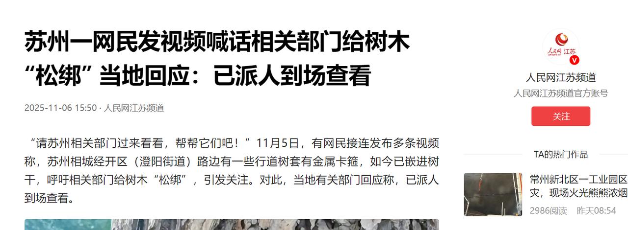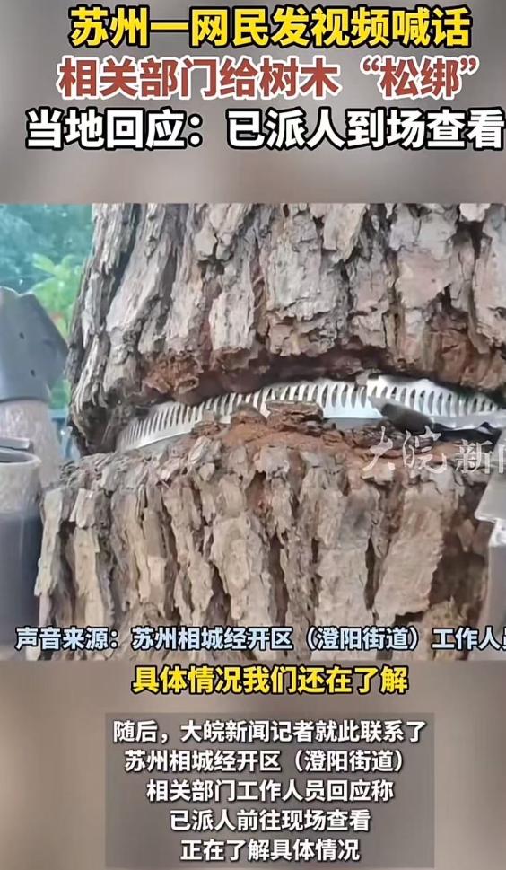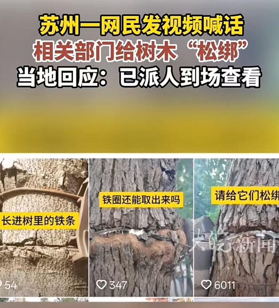 苏州,男子发视频喊话:“请相关部门过来看看,给树木松松绑,帮帮它们吧!”原来,苏州相城经开区路边有一些行道树套有金属卡箍,如今已嵌进树干,男子看着于心不忍,于是发多条视频呼吁相关部门给树木“松绑”!网友:为什么这种事情要等着老百姓发现? 说起来这些金属卡箍最初也是 “好心”,当年这些树还是小树苗的时候,为了让它们在风中站稳脚跟,顺利扎根生长,工作人员给每棵树都套上了金属卡箍,就像给幼苗系上了 “安全带”,本意是挡风遮雨、保驾护航。 可谁也没想到,随着岁月流逝,小树苗渐渐长成了挺拔的行道树,树干一天天变粗,那些本该及时拆除的金属卡箍,却被彻底遗忘在了原地。 如今再看这些树实在让人揪心,原本光洁的树干上,深深嵌着一圈圈金属卡箍,有的已经完全 “吃” 进了树皮里,勒出了触目惊心的深沟,有的树木因为受力不均,树干都长歪了,出现了畸形就像被人死死扼住了咽喉,只能在沉默中承受这份 “慢性绞杀”。 这些卡箍不仅破坏了树木的外观,更严重的是,它们阻断了树木的 “生命通道”,韧皮部无法正常传输水分和营养,时间久了,树木的长势会越来越弱,甚至可能慢慢枯萎。 更让人担心的是安全隐患,现在的树木看似挺拔,可被卡箍勒住的地方,就成了最脆弱的受力点,就像给长大的孩子穿小时候的铁鞋,根本承受不住外力,一旦遇到台风、暴雨等恶劣天气,这些被 “束缚” 的树木很容易从勒痕处折断,而路边人来人往,倒下的树木砸到行人和车辆,后果不堪设想。 这位拍视频的市民就是路过时偶然发现了这些 “受伤” 的树木,看着树木被卡箍勒得痛苦的样子,他实在不忍心,于是拍下多条视频,对着镜头急切地向相关部门喊话,希望能有人来帮帮这些无声的生命,视频上传到网上后,很快收获了数千个点赞,网友们的共情和质疑声也扑面而来。 大家纷纷留言:“树都快被勒断了,日常养护的人难道看不到吗?”“本来是种树造福市民,结果后续管养成了空话,这不是白忙活吗?”“为什么这种本该是基础养护的事,非要等到老百姓发视频上了热搜才重视?” 还有人想起了城市里其他类似的景象,东环路曾被铁架困住的银杏,姑苏区被晾衣绳勒了多年的古柿树,这些例子都戳中了 “重建设、轻管养” 的通病,当年种树时热热闹闹,可一旦树木栽下后续的养护就成了被遗忘的角落。 好在这次当地部门的反应还算及时,没有拖泥带水,视频发酵的当晚和次日凌晨,工作人员就展开了全路段的排查,把数十棵树木身上的金属 “枷锁” 拆除,对于那些伤势最重的树木,还进行了专门的伤口处理,这一夜的忙碌暂时化解了树木的危机,也回应了市民的关切。 但这件事背后暴露的问题却值得深思,虽然危机暂时解除了,但过去很长一段时间里,巡查机制的失灵是不争的事实,所谓的城市精细化管理,不应该只体现在出了事后的 “连夜整改”,更应该是防患于未然的 “日常关照”。 如果工作人员能定期巡查,及时关注树木的生长情况,这些金属卡箍早就该被拆除,根本不会等到树木被勒得伤痕累累才被发现。 其实,城市的温度,从来都不只体现在高楼大厦的高度,更藏在这些容易被忽视的细节里,路边的树木不仅能净化空气、美化环境,更是城市生态的重要组成部分,它们默默伫立在路边,为市民遮风挡雨,本该得到最起码的尊严与呵护。 这次由市民倒逼出来的 “松绑行动”,希望松开的不止是树身上的金属卡箍,更是城市管理思维中那些僵化、被动的 “结”,如果能建立起详尽的树木养护台账,明确养护责任和时间节点,或者推广使用可降解、有弹性的支撑材料,或许就能避免类似的事情再次发生。 (信息来源:人民网)