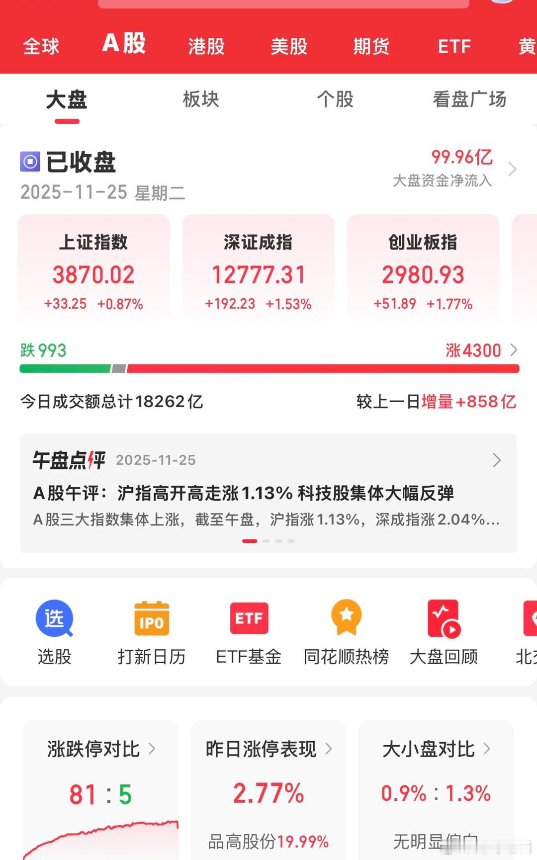 今天的大A总体表现还是不错的,但是随着下午开盘回落,银行板块一路上涨,吸引了大量资金,使得其他板块由于缺少资金而有所回落。下午大盘总体是一个横盘震荡格局,但资金总体呈现流出状态,成交额也是相对上午是缩量的。要想上涨,量能是非常重要的,否则就不会走很远。明天如若量能不能跟上,科技板块出现调整,大盘会继续调整的,如若今天强势站上3880以上,那就比较好了。