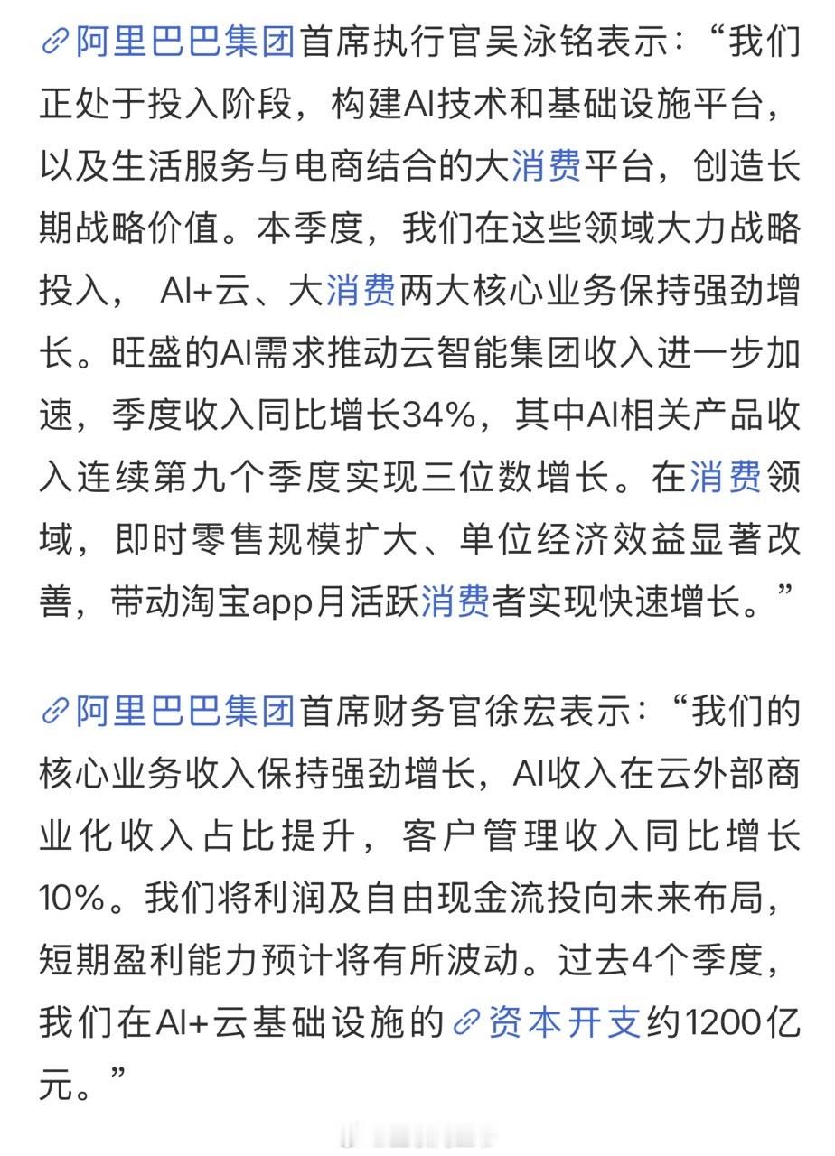 早期投入AI的企业,慢慢开始看到效益了。阿里最新季度财报公布,集团收入2477.95亿元,超市场预期,去掉已出售业务影响,收入同比增长15%。其中,旺盛的AI需求推动云智能集团收入进一步加速,季度收入同比增长34%。阿里也算最早一批布局AI的企业,目前AI相关产品收入连续第九个季度实现三位数增长。更重要的是,还能带动其他业务的增长。所以很多头部互联网企业的科技基因,通常是很强大的,毕竟谁也不想掉队。