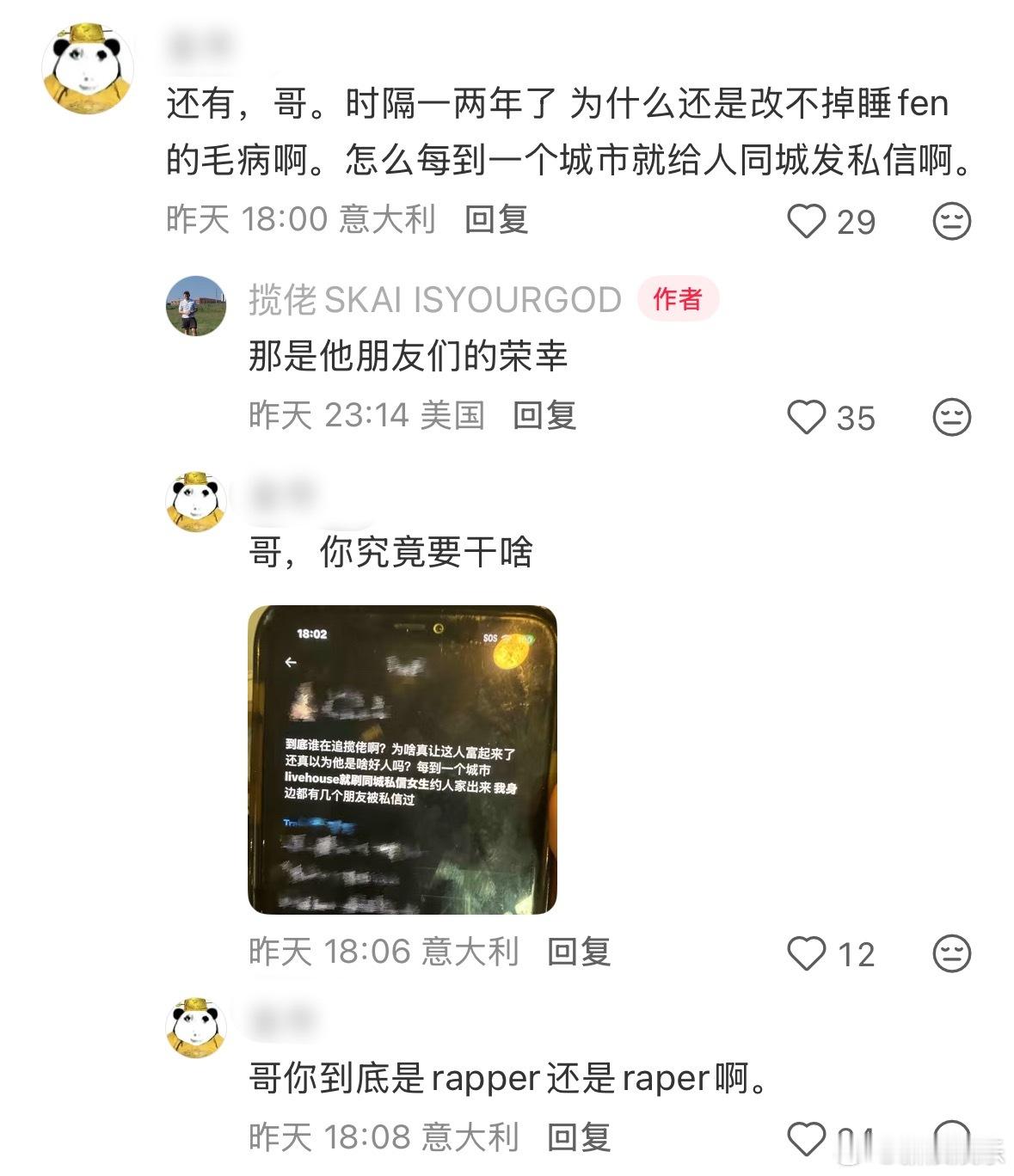 《八方来财》和《大展宏图》的歌手揽佬被曝睡粉。粉丝评论他爆料截图,“每到一个城市livehouse就刷同城私信女生约人家出来,我身边都有几个朋友被私信过”,揽佬回复:“那是他朋友们的荣幸。” (新浪娱乐)