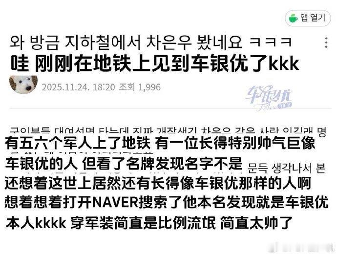 韩国网友分享坐地铁偶遇 ,“上来五六个军人,有一位特别帅像车银优!”后来搜索才发现就是本人,欧巴是和同期们一起去拍大头贴了,车银优穿帅到和其他人不是一个图层