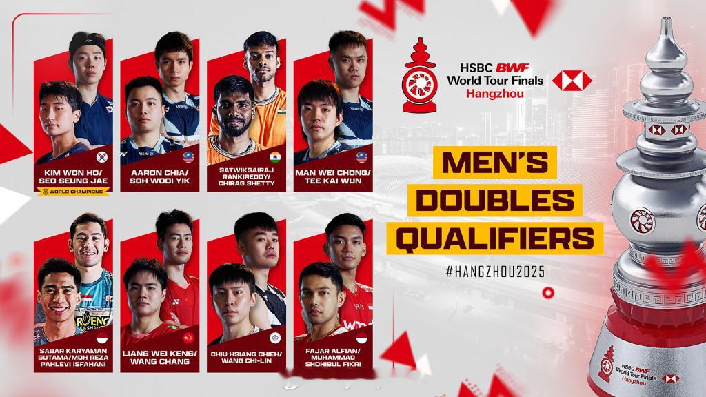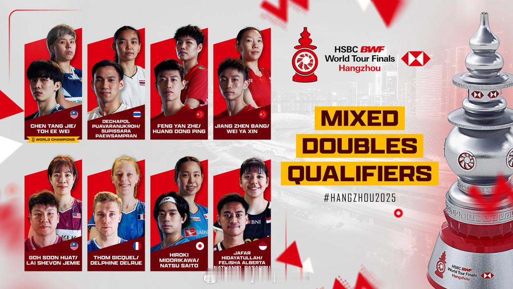 【世界羽联官宣年终总决赛名单】 11月25日,世界羽联官宣了获得年终总决赛的五个单项选手名单。比赛将于12月17-21日在杭州举行。男单:石宇奇、昆拉武特(泰国)、李诗沣、周天成(中国台北)、安东森(丹麦)、C-波波夫(法国)、乔纳坦(印尼)、奈良冈功大(日本)女单:山口茜(日本)、安洗莹(韩国)、王祉怡、韩悦、瓦达尼(印尼)、李美妙(泰国)、因达农(泰国)、宫崎友花(日本)男双:金元浩/徐承宰(韩国)、苏伟译/谢定峰(马来西亚)、兰吉雷迪/谢蒂(印度)、万纬聪/郑凯文(马来西亚)、古塔玛/伊斯法哈尼(印尼)、梁伟铿/王昶、邱相榤/王齐麟(中国台北)、阿尔菲安/费克里(印尼)女双:刘圣书/谭宁、陈康乐/蒂娜(马来西亚)、金慧贞/孔熙容(韩国)、贾一凡/张殊贤、福岛由纪/松本麻佑(日本)、岩永铃/中西贵映(日本)、白荷娜/李昭希(韩国)、谢沛珊/洪恩慈(中国台北)混双:陈堂杰/杜依蔚(马来西亚)、德差波/苏皮萨拉(泰国)、冯彦哲/黄东萍、蒋振邦/魏雅欣、吴埙阀/赖洁敏(马来西亚)、吉奎尔/德尔鲁(法国)、绿川大辉/斋藤夏(日本)、希达亚图拉赫/帕萨里布(印尼)