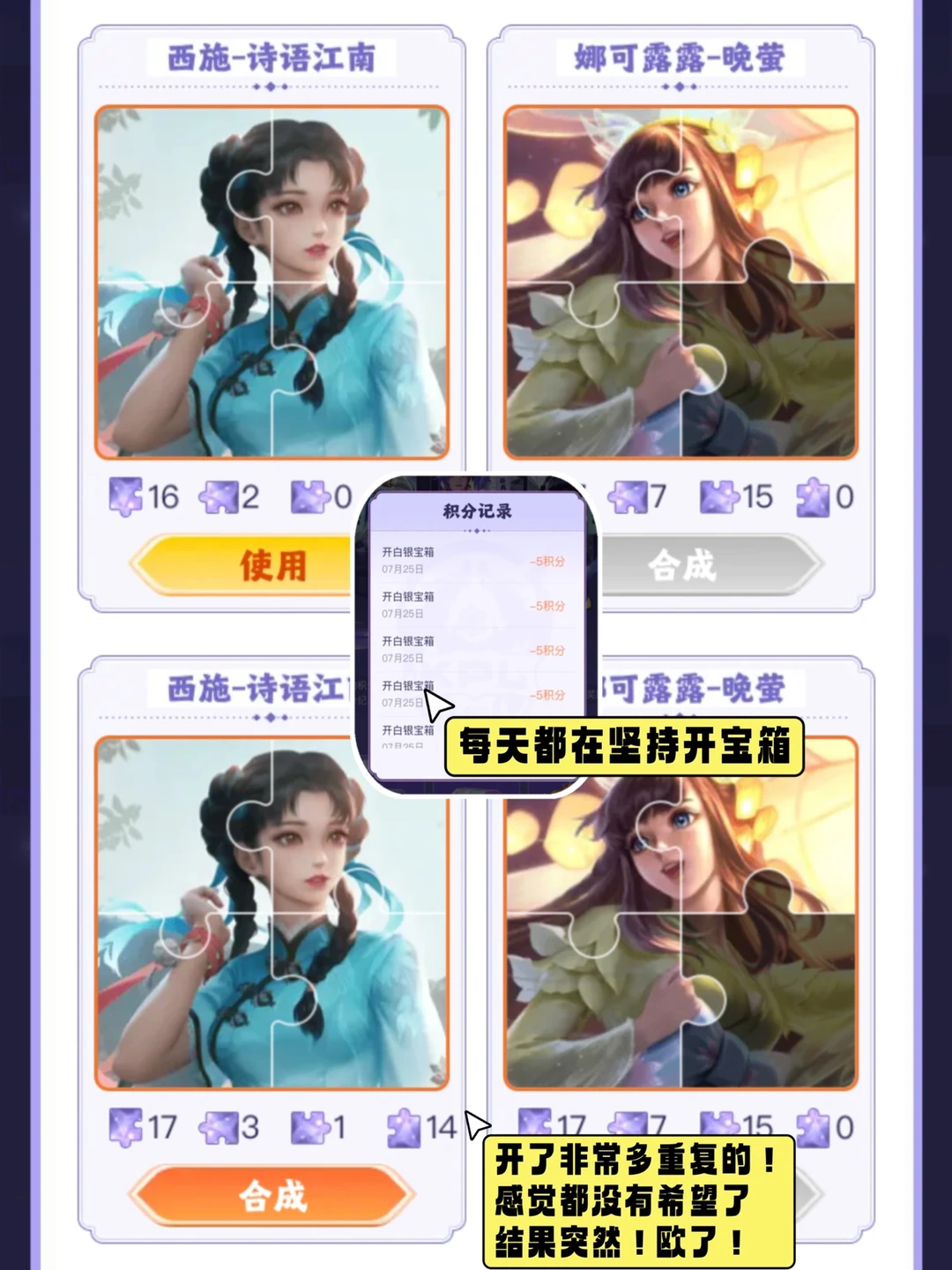 ❣️名称:美团 ❣️设备:安卓✔️ 苹果✔️ · 🔺宝子们,作为一个十足的非洲人,真的没有想我也有逆袭的一天[哭惹R]!上期一直在攒碎片🧩,到后面几天有好多重复碎片都有十几个了,结果都还是缺一两个,才能合成皮肤的状态,当时都想放弃了。结果到最后一天,居然抽到缺少的那个西施碎片🧩‼️没想到努力型选手真的能得到! - 💬新的一期美团薅羊毛获得又来了‼️和我一样,一直不是很欧的宝子们,我们继续一起努力💪🏻,这次我要向香香的皮肤前进‼️宝子们快冲~ ·