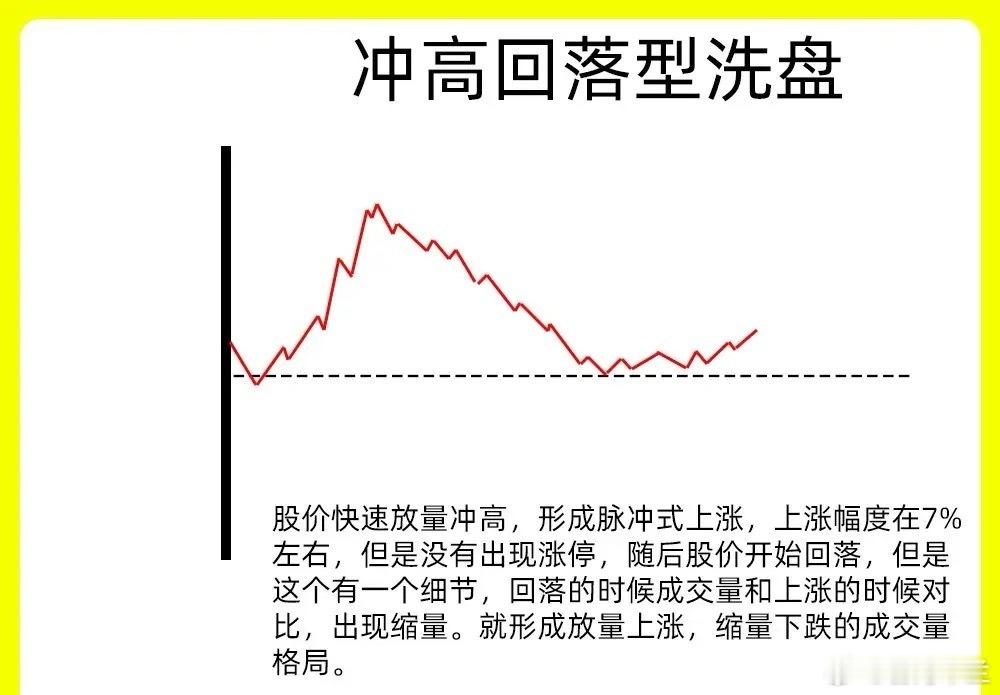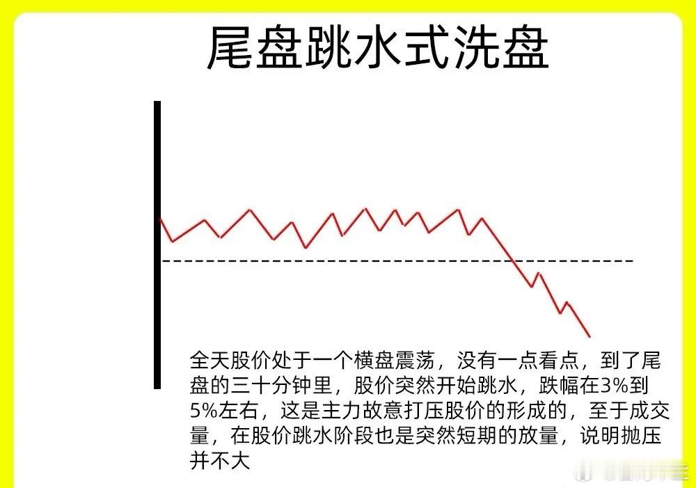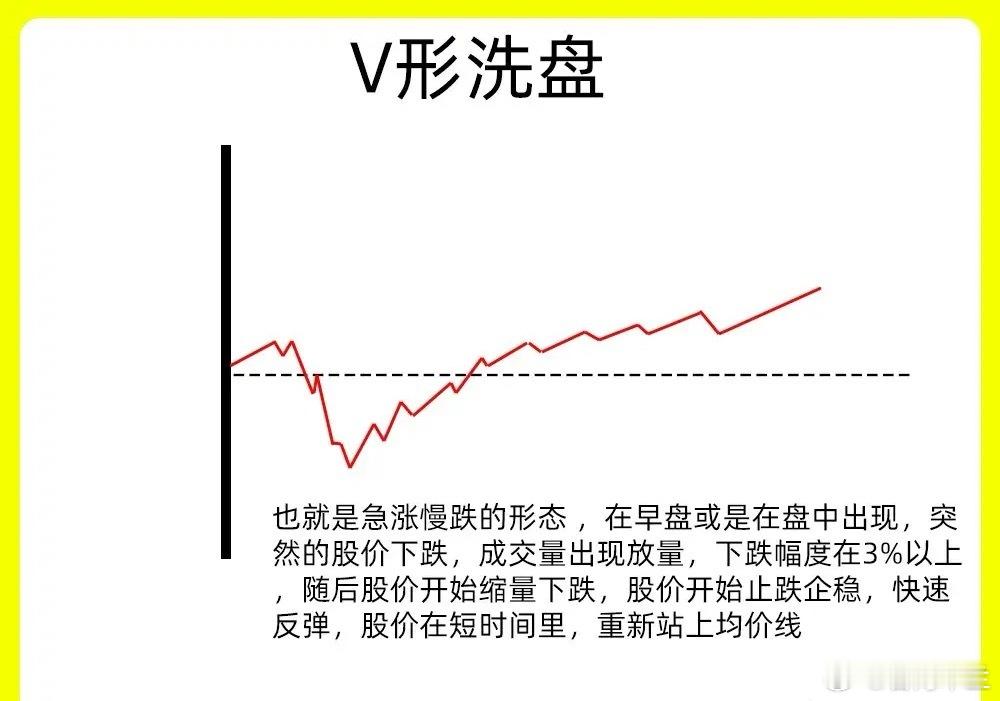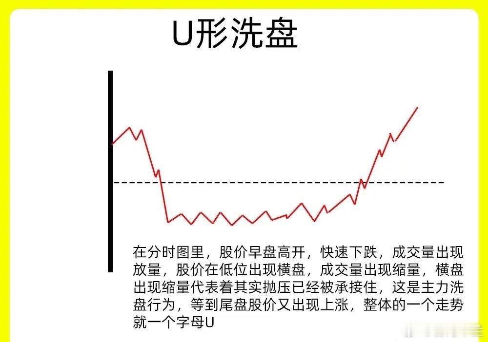 注意了!大部分短线选手的最为苦恼的事情,就在分时图中,判断主力是否在洗盘。作为短线选手,分时图是一个绕不开的,而且比日K线还重要。只有真正看懂分时图的形态,才能有效判断主力是在出货还是洗盘。今天老九就分享几种分时洗盘的形态,吃透这些走势,我想能立马提高盘感能力一、V形洗盘也就是急涨慢跌的形态 ,在早盘或是在盘中出现,突然的股价下跌,成交量出现放量,下跌幅度在3%以上,随后股价开始缩量下跌,股价开始止跌企稳,快速反弹,股价在短时间里,重新站上均价线。这是典型的主力洗盘,主力故意打压股价,进行吸筹洗盘。二、U形洗盘在分时图里,股价早盘高开,快速下跌,成交量出现放量,股价在低位出现横盘,成交量出现缩量,横盘出现缩量代表着其实抛压已经被承接住,这是主力洗盘行为,等到尾盘股价又出现上涨,整体的一个走势就一个字母U。三、横盘震荡全天的走势都是1%左右震荡,均价线代表的平均持仓成本,而均价线全天几乎平行运行,成交量和之前对比,出现大幅的缩量,全天走势像织布机,在这种走势里,散户是很少有耐心的,走势很无趣四、冲高回落型洗盘这种走势一般是股价低位横盘阶段或是上涨趋势的初期,股价在分时图里,股价快速放量冲高,形成脉冲式上涨,上涨幅度在7%左右,但是没有出现涨停,随后股价开始回落,但是这个有一个细节,回落的时候成交量和上涨的时候对比,出现缩量。就形成放量上涨,缩量下跌的成交量格局。五、尾盘跳水式洗盘在分时图里,全天股价处于一个横盘震荡,没有一点看点,到了尾盘的三十分钟里,股价突然开始跳水,跌幅在3%到5%左右,这是主力故意打压股价的形成的,至于成交量,在股价跳水阶段也是突然短期的放量,说明抛压并不大。以上就是我们常见的分时图洗盘,当然有其他的,比如股价涨停炸板洗盘,主力利用股价炸板来清洗不坚定筹码。还有拱型洗盘,整体走势像一个N字。下方我配了对应案例图,建议文章和案例一起看。希望对大家有启发和帮助,也是最为基础的内容,一定吃透。我们下期内容再见