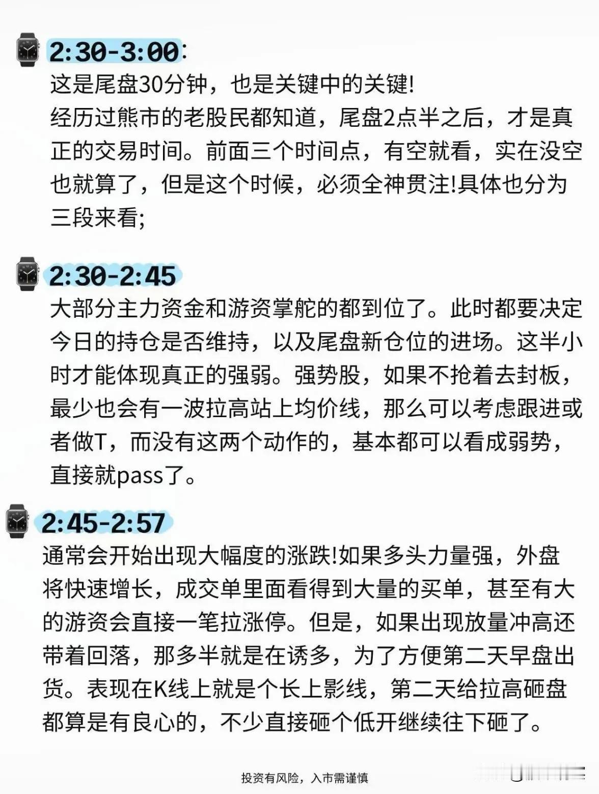 高效盯盘实战指南:把握四个关键时段 想要在股市中精准把握机会,盯盘技巧至关重要。以下是盘中四个关键时段的观察要点,助你提升操作胜率。 1. 开盘9:35:量能定基调 开盘5分钟内会集中成交隔夜委托单。若此时成交金额未达昨日尾盘2倍,市场动能可能不足,应考虑在30分钟内逢高减仓,规避弱势震荡风险。 2. 上午10:00:锁定龙头动向 此时强势股已明确启动信号:或放量拉升、或贯穿分时均价线、或持续沿均价线攀升。唯有维持强势形态的个股才值得参与,否则应观望或果断止盈。 3. 午后13:05:捕捉午间机会 机构决策者午间休整时,盘面反应稍显迟缓。若分时均价线走平或呈上行趋势,可趁股价回踩时轻仓介入,往往能捕捉到异动吸筹的短暂机会。 4. 尾盘14:30-15:00:决战黄金半小时 · 14:30-14:45:主力决定持仓方向,强势股会拉高站稳均价线,可跟进或做T,弱势股则需淘汰。 · 14:45-14:57:多空博弈白热化,外盘激增或大单封板预示强势,若放量冲高回落则警惕诱多,次日常现长上影或低开闷杀。 · 14:57-15:00:集合竞价若平稳则延续趋势,拉高预示次日续涨,反之则承压。需注意尾盘突放巨量可能是转势信号,应制定次日应对计划。 盯盘需结合量价时空,保持专注与纪律,方能在波动中稳握先机。 收盘前策略 拐点交易战法 盯盘看股票口诀 六次短线交易 市场定位策略 期货盯盘技巧 主力控盘技巧 低吸手法 股票交流 股票知识 股票投资 正版 看盘方法与技巧大全 零基础学操盘手 股市炒股入门股票书籍