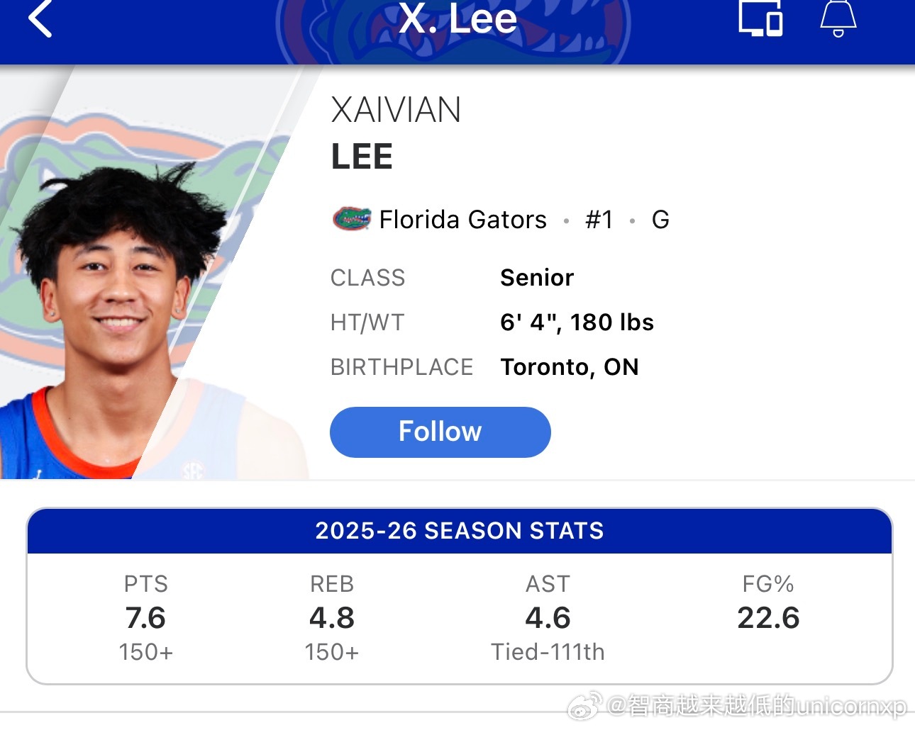 韩裔后卫Xaivian Lee新赛季糟糕表现遭外界吐槽。曾经的普林斯顿当家球星从常青藤转校来到NCAA冠军佛罗里达大学后,本赛季目前场均仅得到7.6分4.8板4.6助,更糟糕的是他的投篮命中率对比上赛季直接砍半仅为22%,三分球命中率15.8%,休赛季他主动放弃参选拿着巨额NIL合同加盟佛罗里达大学,同时还与国产SPO签下了多年合同,合计NIL收入高达600万美金,如今的表现令佛罗里达大学和品牌方成了冤大头