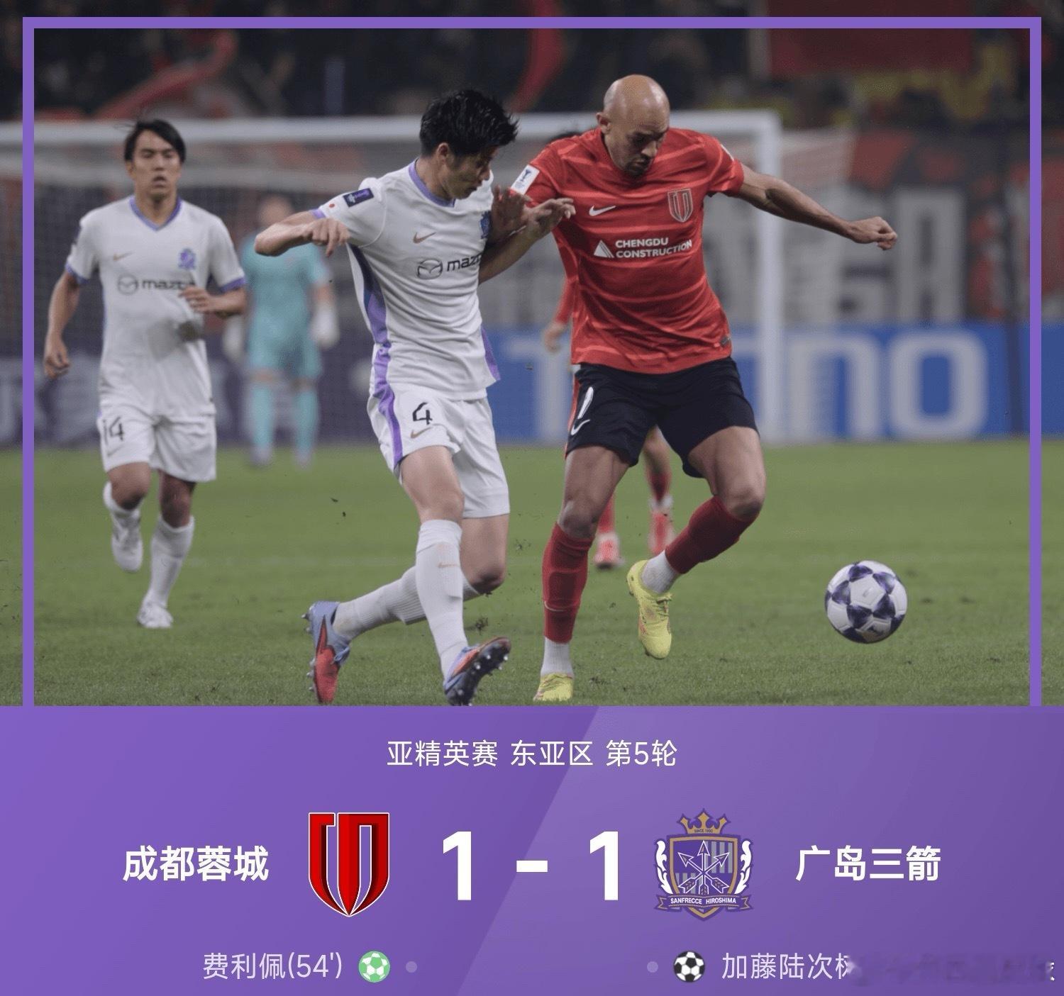 亚精英赛战报:费利佩点射、加藤陆次树扳平,蓉城1-1广岛 11月25日讯 25/26赛季亚精英赛东亚区第5轮,成都蓉城1-1战平广岛三箭。上半场,两队均无建树;下半场,周定洋造点费利佩主罚命中为蓉城取得领先,广岛随后由加藤陆次树扳平比分,最终两队1-1战平,成都蓉城拿到1分后位列积分榜第10位。