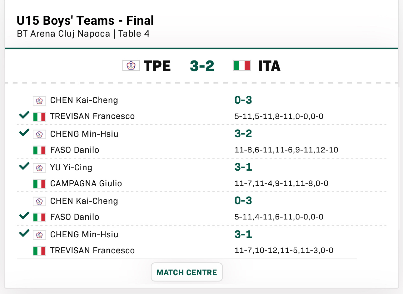 2025世青赛U15男团决赛中国台北3-2意大利陈凯程0-3特维山郑旻修3-2法索余奕庆3-1坎帕亚陈凯程0-3法索郑旻修3-1特维山郑旻修是郑怡静的亲弟弟