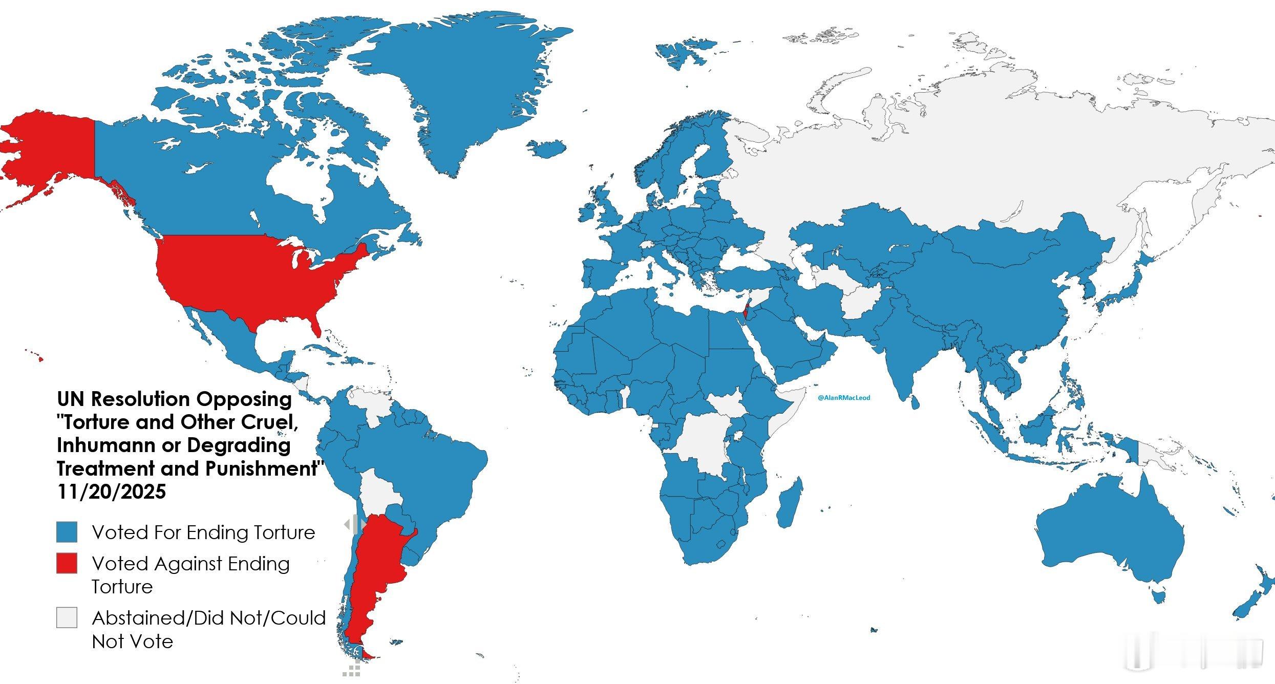 联合国11月20日通过了一项决议,反对“酷刑和其他残忍、不人道或有辱人格的待遇和处罚”。三个国家投了反对票:美国、以色列、阿根廷。