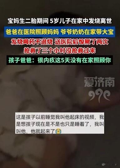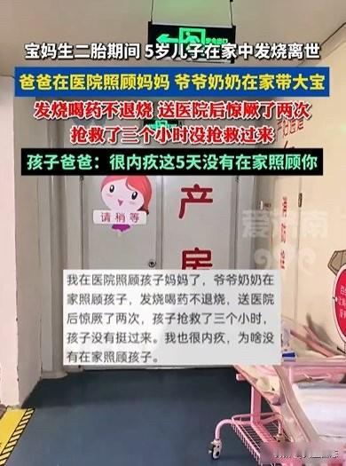 孩子发烧五天没人管,父母在医院陪二胎,祖辈不懂急救酿悲剧 那天傍晚,小宇突然抽搐起来,嘴唇也发紫了,家里的人一下子慌了神,赶紧把他送去医院抢救,三个小时过去,孩子还是没能救回来,他才刚刚五岁,本来第二天妹妹就能出院,一家人马上就能团聚在一起。 他妈妈刚做完剖腹产手术,还在打点滴,听到这个消息整个人都垮了,爸爸留在医院陪着产妇,一整天都没打电话问问大儿子的情况,爷爷奶奶在家里照顾孩子,给他喂了药也擦了身体,但他们不清楚体温连续五天超过39度会有多危险。 农村老人总觉得发烧时扛着就行,谁都没想到孩子会突然抽筋,其实三岁以内的小孩体温一到38.5度就容易抽搐,能救人的时间只有半小时,小宇连续烧了五天,这早就不是普通感冒了,可家里没人想到要送他去医院。 如今有六成中国小孩由爷爷奶奶照顾,但很多老人并不清楚基本的儿科知识,比如孩子发生惊厥时不能强行灌水、不能按压胳膊和腿,应该让孩子侧躺防止窒息,而且当体温超过39度并持续一天以上就必须去看医生,这些知识本身不难,只是没有人告诉他们。 家里连电子体温计都没有准备,退烧药的服用方法也没写清楚,父母不是不关心孩子,只是觉得有老人照看就行,结果五天过去,没人问过孩子退烧没有,也没人记录体温变化,这算不上疏忽大意,而是整个家庭结构里存在的一个盲区。 今年冬天流感很严重,北京和上海的不少幼儿园都停课了,卫健委之前就发布过儿童高烧的急救指南,但社区医院没有好好宣传,托儿所也没有检查家长是否准备了应对方法,本来可以提前安排的事情,都被那种觉得不会出事的想法给耽误了。 要是家里准备一个体温记录本,祖父母懂得抽筋时要侧躺下来,爸爸妈妈每天打个电话问问情况,可能事情的结果就会变得不一样,这不是要责怪谁,而是大家都没把家里的老大当回事来看待,家里有了第二个孩子,老大就被大家当成能自己扛住所有事的人,这种想法其实挺危险的。 孩子发烧 孩子生病