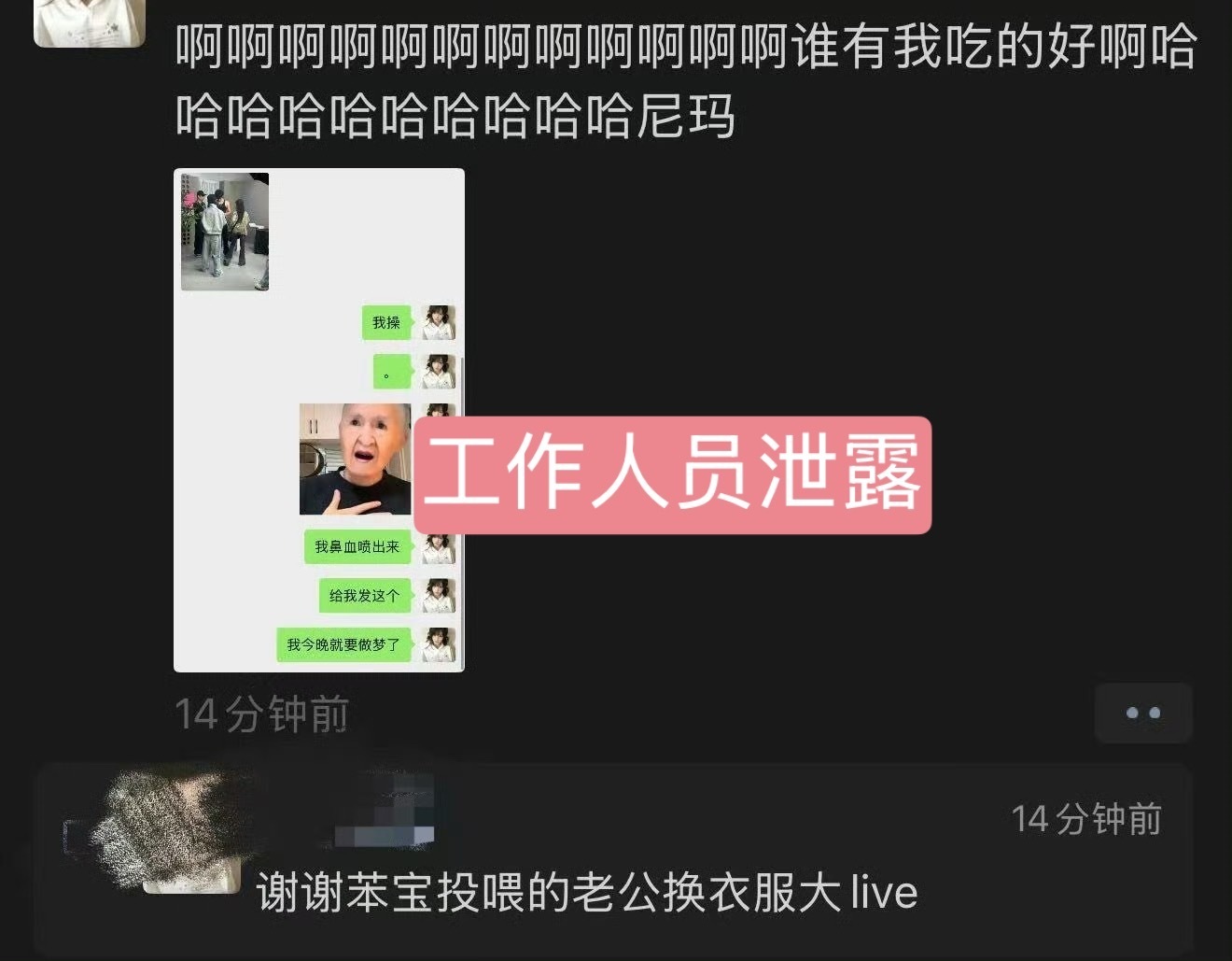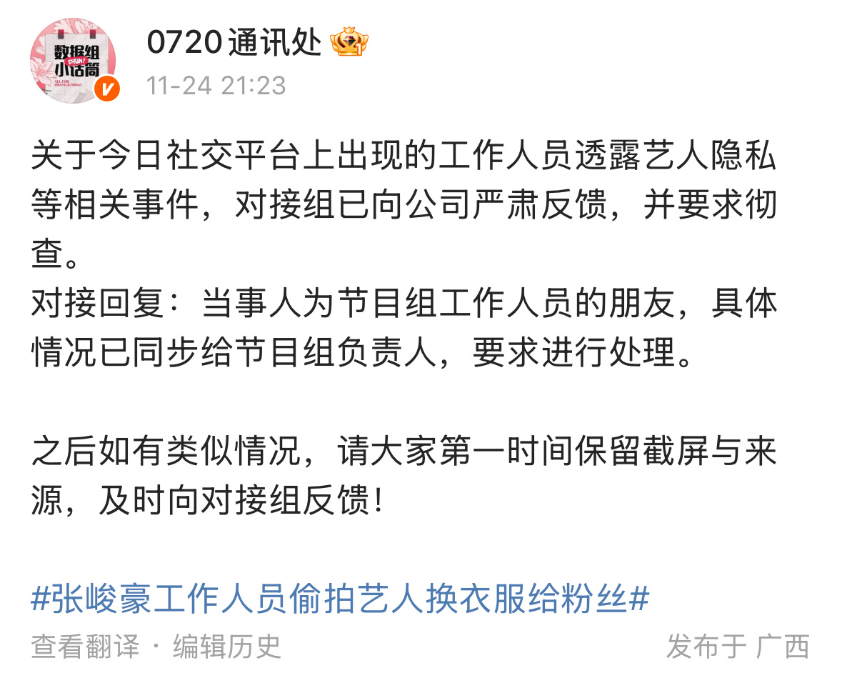 张峻豪疑似回应被偷拍,配图文字:“无语”(1-3)起因是张峻豪被工作人员偷拍换衣照片私下发送给粉丝,因为在朋友圈炫耀而曝光(p4-7)随后对接回复:当事人为节目组工作人员的朋友,具体情况已同步给节目组负责人,要求进行处理。(p8)