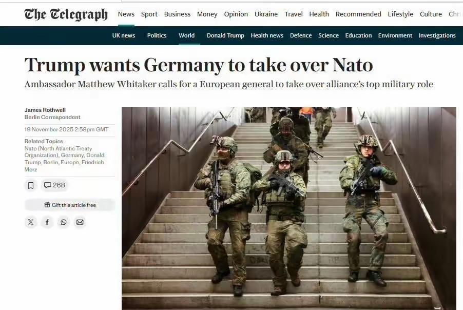 老特一上台就要求北约成员国把军费提高到GDP5%,但目前没有一个北约国家做到了。 另一方面他最近自爆出了自己指挥不了美国的枪杆子了,部分民主党将领对他的命令置之不理。 国内指挥不了,国外的北约估计也够呛, 毕竟他朝令夕改已成性,没人知道早上的特朗普可信的,还是下午的可信,也许明天一来,今天的特朗普就被自己否定了。 而他一直想快速促成俄乌和谈,心心念念地想赶在明年一月份前结束战争,好拿到诺贝尔和平奖。 但德国默茨却说如果北约不继续支持,那德国将单独给武器、给钱继续支持乌克兰打下去。 这或许就是特朗普想把担子甩给德国的原因。关键是一个驻扎着大量美军的战败国,他敢接手吗?