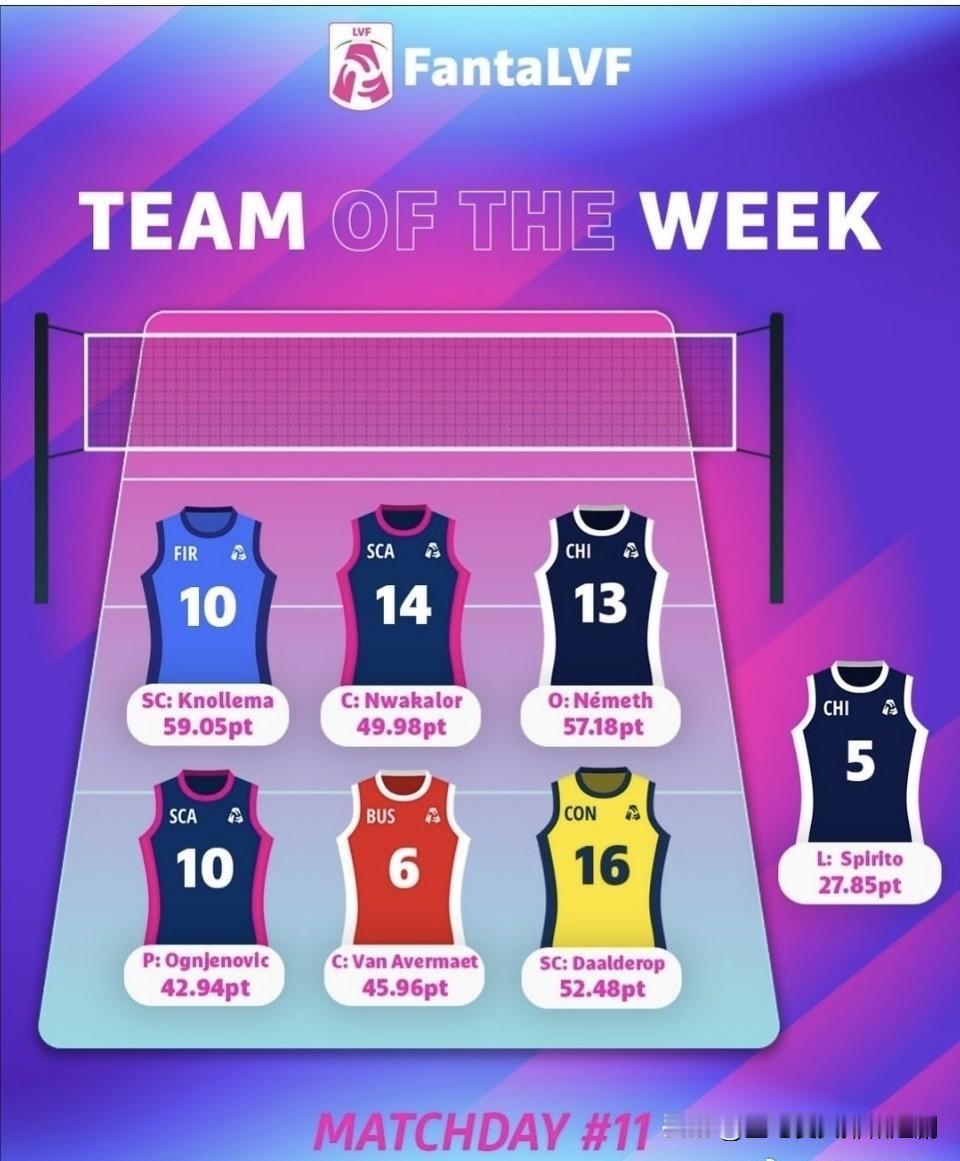 2025-2026赛季意大利常规赛第十一轮最佳阵容。 主攻:科诺莱玛🇳🇱(佛罗伦萨),达尔德罗普🇳🇱(科内利亚诺) 副攻:L.恩瓦卡洛(斯坎迪奇),西尔克🇧🇪(布斯托阿西齐奥) 接应:内梅斯🇭🇺(基耶里) 二传:奥杰年诺维奇🇷🇸(斯坎迪奇) 自由人:斯皮里托(基耶里)