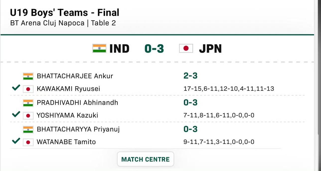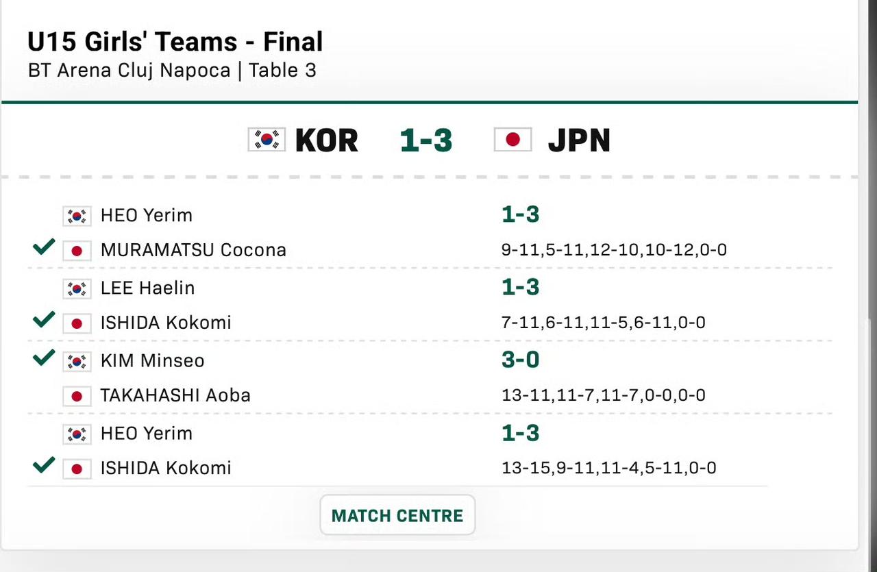 中国夺得乒乓球青少年世锦赛U19女团冠军! 11月26日,决赛再中国和日本之间进行。 第一盘,纵歌曼2-3青木咲智,比分11-6,6-11,11-7,7-11,9-11。第二盘,覃予萱3-0小盐悠菜,比分11-9,11-4,11-5。第三盘,姚睿轩3-0高森爱央,比分11-9,11-8,11-7。第四盘,覃予萱0-3青木咲智,比分7-11,9-11,6-11。第五盘,纵歌曼3-2小盐悠菜,比分12-14,9-11,13-11,12-10,11-8。 恭喜中国队夺得世界青少年乒乓球锦标赛U19女团冠军! U19男团冠军、U15男女团体冠军分别是日本、中国台北、日本。