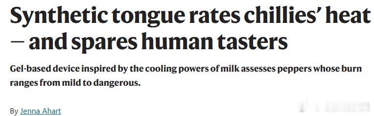 人造“舌头”问世:能精准评估辣椒辣度!11月21日,发表在《ACS Sensors》杂志上的一项研究显示,一种基于凝胶的创新装置正在改变我们评估辣椒辣度的方式。这种人造舌头能够准确测定从温和的甜椒到极具挑战性的四川菜“朝天椒”等各种食物的辣度,为食品质量控制提供了全新解决方案。该装置的核心灵感来源于牛奶缓解辣味的天然特性。华盛顿州立大学普尔曼分校的食品科学家卡罗琳·罗斯解释说,“牛奶中含有影响我们对辣味感知的蛋白质”,这些蛋白质能够有效减轻辛辣菜肴带来的灼烧感。研究团队从这一日常现象中获得灵感,将牛奶的天然解辣特性融入装置设计中。这种合成舌头的制作采用了独特配方,由含有奶粉、丙烯酸和氯化胆碱的凝胶构成。当电流施加到凝胶上时,其中的氯离子和氢离子因具有流动性而能够导电。研究团队设计了精密的监测系统:将凝胶置于铜片之间,并将整个装置连接到测量电流的工作站。关键在于辣椒素——这种赋予辣椒辣味的化合物会与凝胶中的牛奶蛋白相互作用,形成庞大的复合物,从而干扰离子流动。当舌头接触到辣椒素时,其导电性会相应下降。通过测量这种导电性变化,研究人员就能精确量化辣椒的辣度。该研究的合著者、华东理工大学化学工程师胡静表示,虽然人造舌头技术本身并非全新概念,但团队特别聚焦于辣度的精确测量,这在食品质量控制领域具有重要意义。随着这项技术的推广,食品行业将迎来辣度测量的标准化时代,消费者在购买辣味食品时或许很快就能看到精确的辣度标签,让辛辣体验既刺激又安心。