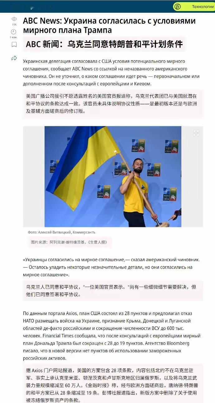 司机原则上同意了美版的和平协议,而不是欧版的。 恰恰说明了一个问题:乌克兰打不下去了!随着红军城基本被俄罗斯控制后,司机的防线几乎要被突破了,整个后勤补给成了大问题! 另,美国联邦调查局调查司机涉480亿美元的贪腐案被曝光后,他更担心的不再是俄乌战场了,而是自己是否会被秋后算账。 所以他才会在美国规定的27号之前,接受了这样一份卖国的丧权条约。 毕竟他是如何上台的,背后的支持者是谁,他比谁都清楚。 这有点悲壮,但也有可能仅仅就是一出戏,本色出演了一场政客需要的大戏罢了。真正受到伤害的、牺牲的,是四千多万乌克兰人民。
