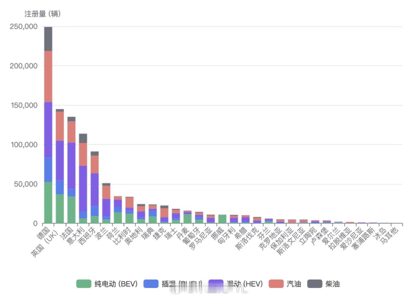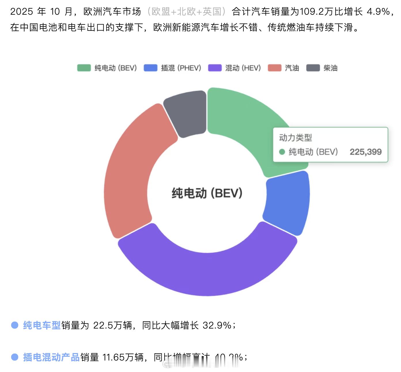 欧洲在10月也形成了22万纯电,插电 11.65万辆的规模。这个数据主要是之前规划纯电产品按照平价在核心区域销售。纯电 BEV 由德、英、法三大核心市场主导,合计超过半数份额● 第一梯队,远远超过1万台◎ 德国:52,425(+47.7%)◎ 英国:36,830(+23.6%)◎ 法国:34,108(+63.2%)● 第二梯队 1万台左右◎ 荷兰:13,968(+27.4%)◎ 比利时:12,360(-3%)◎ 丹麦:11,405(+29.3%)◎ 挪威:10,852(-0.1%)其他区域都是几千台的规模。
