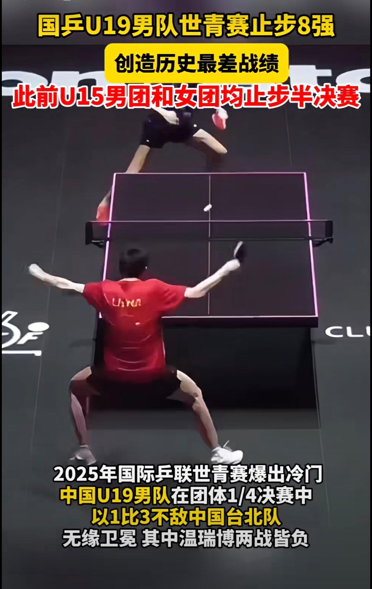 国乒U19男队世青赛止步8强,创造历史最差战绩,此前U15男团和女团均止步半决赛。国乒U19男队世青赛止步8强 2025年国际乒联世青赛 中国u19乒乓男团不敌中国台北