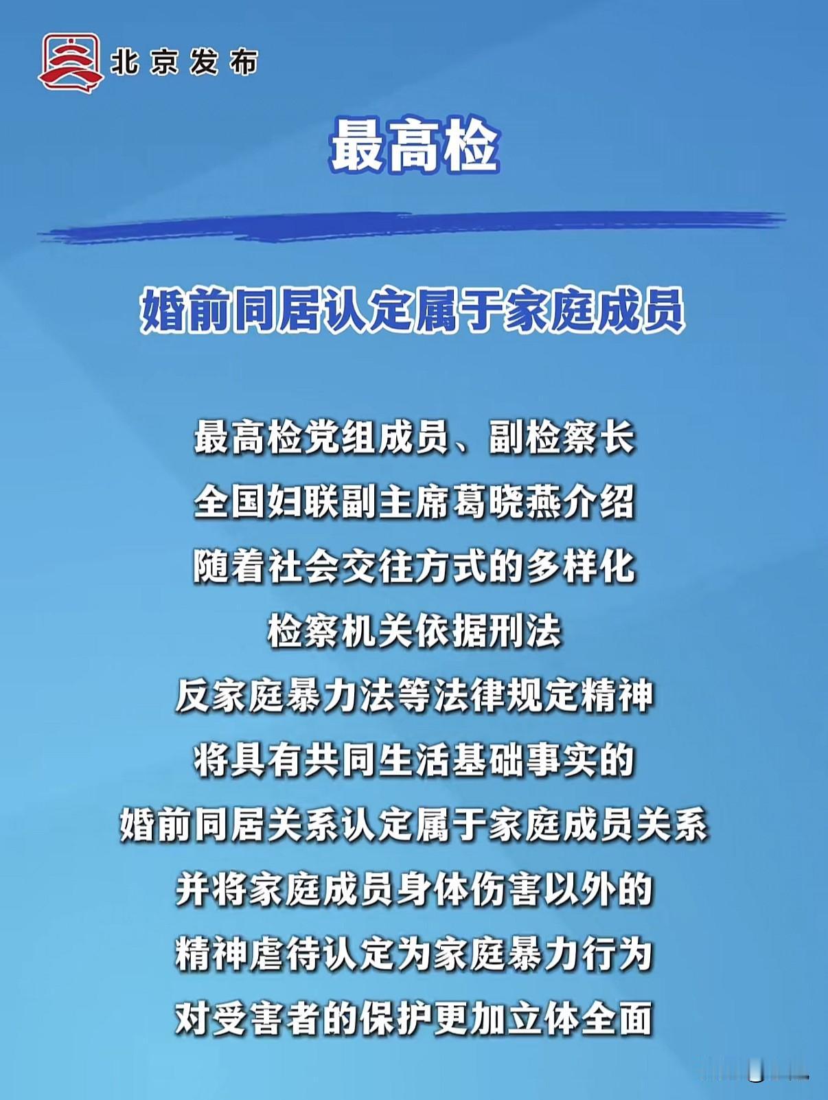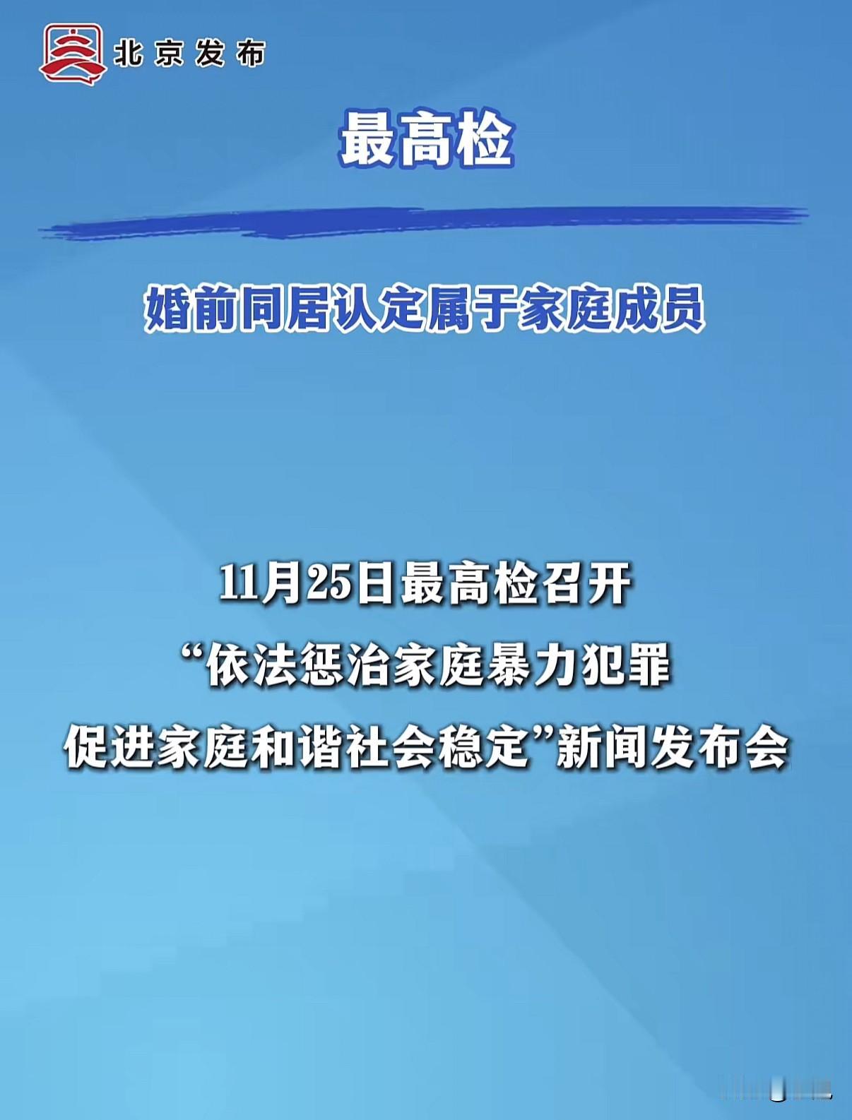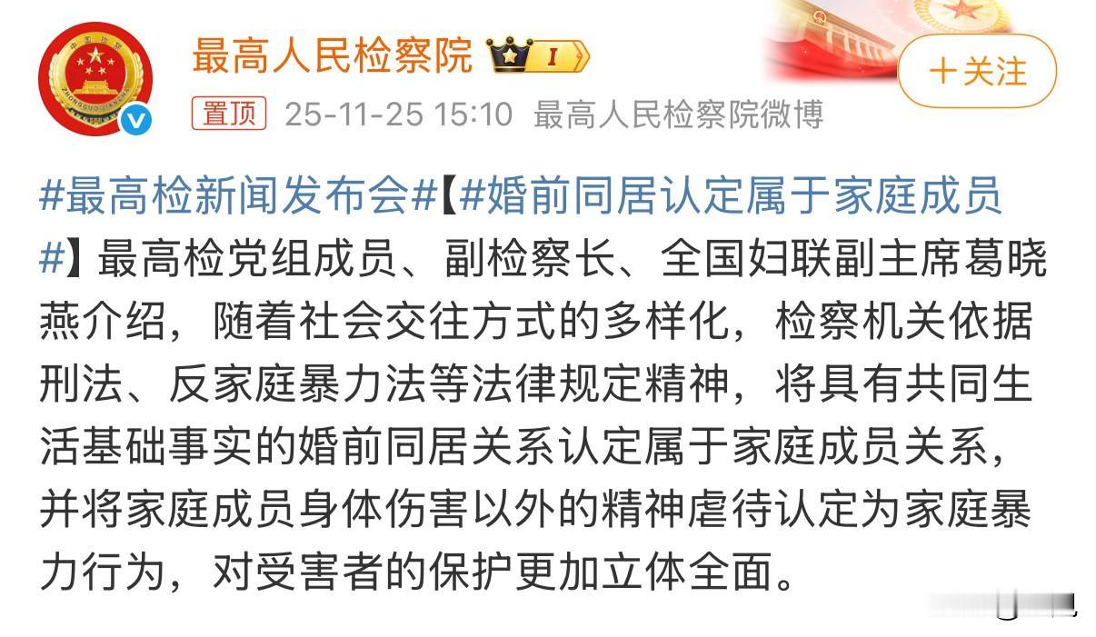 没领证也算家暴?最高检明确:婚前同居就是家庭成员,精神折磨也犯法! 最高检发布的案例刷新了许多人认知。婚前稳定同居,法律上认定为家庭成员关系。长期辱骂、控制社交、精神打压,这些都算家庭暴力。 有个真实案例让人心痛。25岁女子苗某与男友马某某同居生活,两人已见过家长、谈婚论嫁。 马某某经常翻旧账:“你以前那些事,我心里一直过不去。” 苗某想出国进修,他坚决反对:“你出去了,我怎么能放心?” 他要求苗某删除所有异性微信,随时报备行踪,限制她的正常社交。 这种精神折磨持续了整整一年。苗某先后三次自杀,前两次被救回,第三次不幸离世。 检察机关认定,两人具有共同生活事实,属于家庭成员关系。马某某的长期精神虐待构成虐待罪,被判三年两个月。 这个判决突破了传统认知。没领结婚证,住在一起就是一家人。身上没伤痕,心里受折磨也算家暴。 为什么法律要这样界定? 现在很多年轻人选择婚前同居,这段关系中发生的暴力行为,危害程度不亚于婚姻内。如果不纳入法律保护,大量受害者将求助无门。 精神虐待的危害性不容小觑。它不像身体暴力那样肉眼可见,却能在无形中摧毁一个人的意志。持续的贬低、控制、孤立,会让受害者陷入自我怀疑,最终崩溃。 数据显示,2021年以来,检察机关已批捕家暴犯罪嫌疑人2800余人。家暴案件批捕率比普通刑事案件高出近10个百分点。 这说明司法机关正在加大对家庭暴力的打击力度,法律定义也在随着社会关系的变化而更新。 这个消息一出,立即引发热议。 有网友支持:“做得好!很多同居受害者以前告状无门,现在终于有法可依了。” 也有网友担忧:“这样会不会管得太宽?谈恋爱分手会不会被反咬一口?” 从检察机关的解释来看,关键要看是否形成“稳定的共同生活状态”。比如是否长期同居、经济混同、生活深度捆绑,像真正的一家人一样。 这个新规你怎么看?是保护过度还是势在必行?欢迎在评论区说说你的看法。