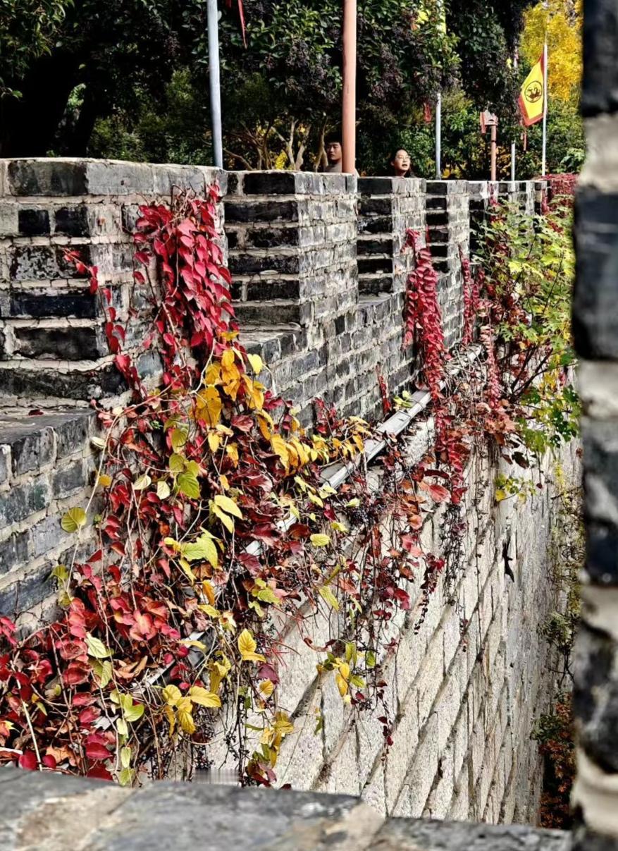 老墙裹了秋的彩衣,红的热烈、黄的温柔,连风路过都慢了半拍。 秋把背景染成蜜色,石