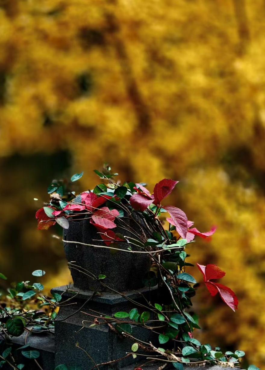 老墙裹了秋的彩衣,红的热烈、黄的温柔,连风路过都慢了半拍。 秋把背景染成蜜色,石墩上的叶簇,是红与绿偷藏的温柔。