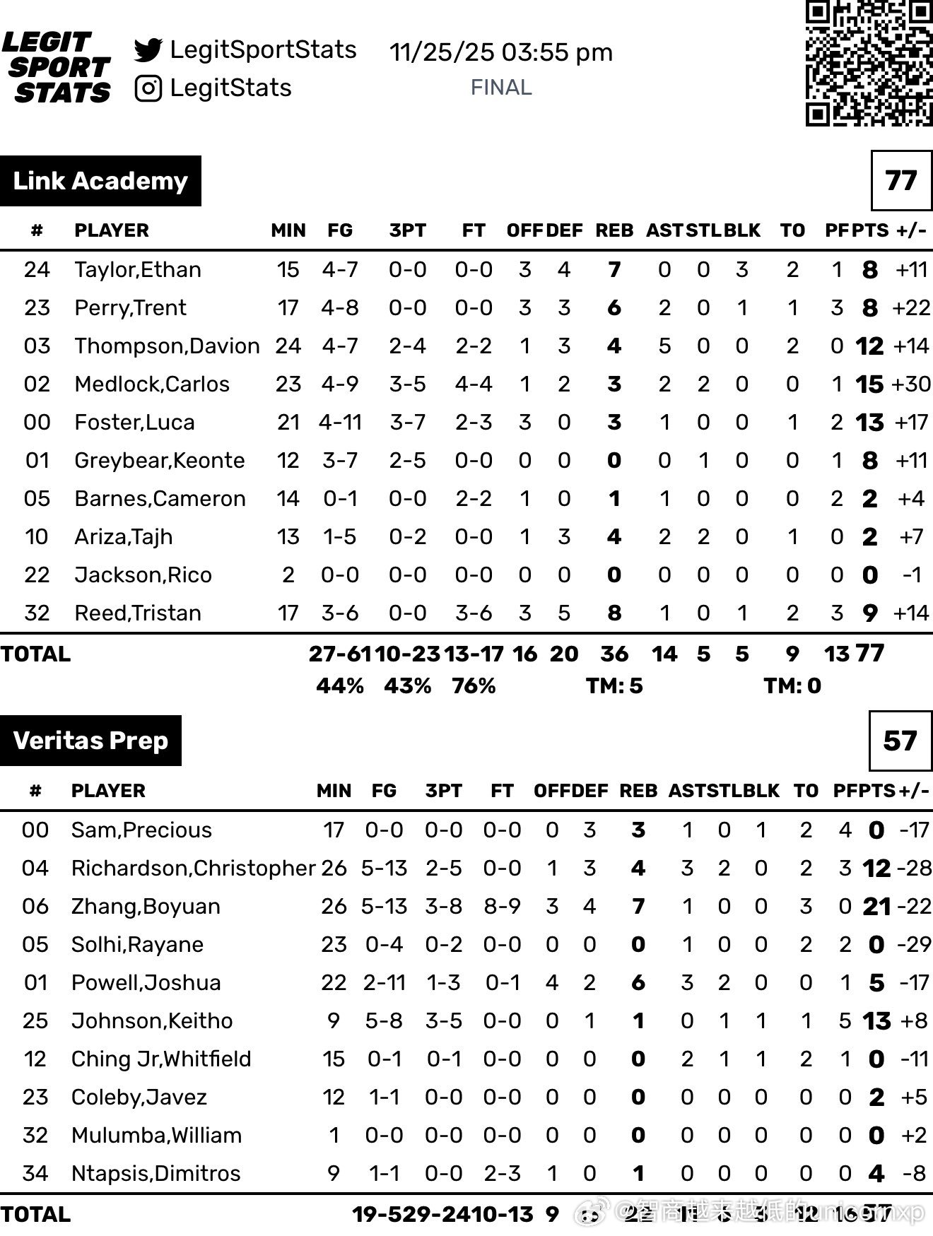 Veritas vs Link全场技术统计,张博源这表现拿到high-major offer妥妥的
