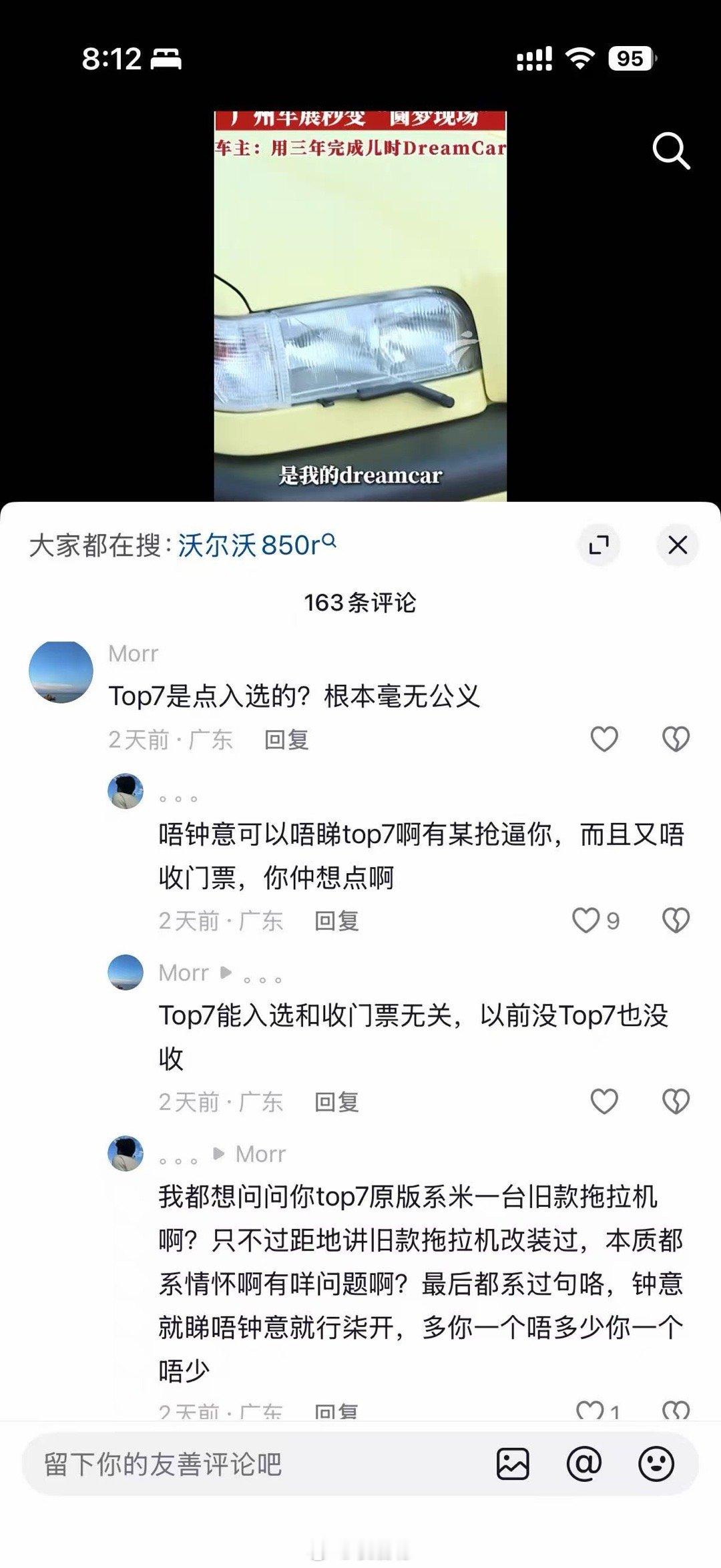 网友发了几张截图给我,有网友对情怀车展有些意见,认为TOP7无资格入选,还有一些