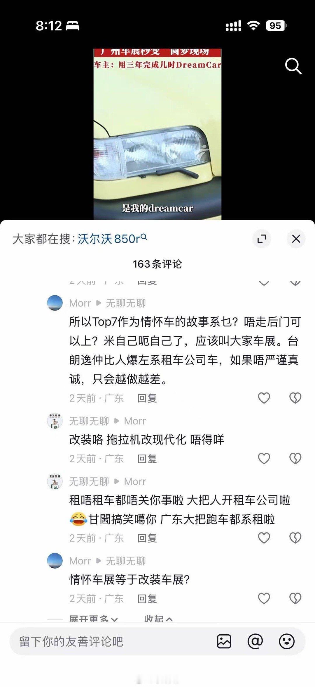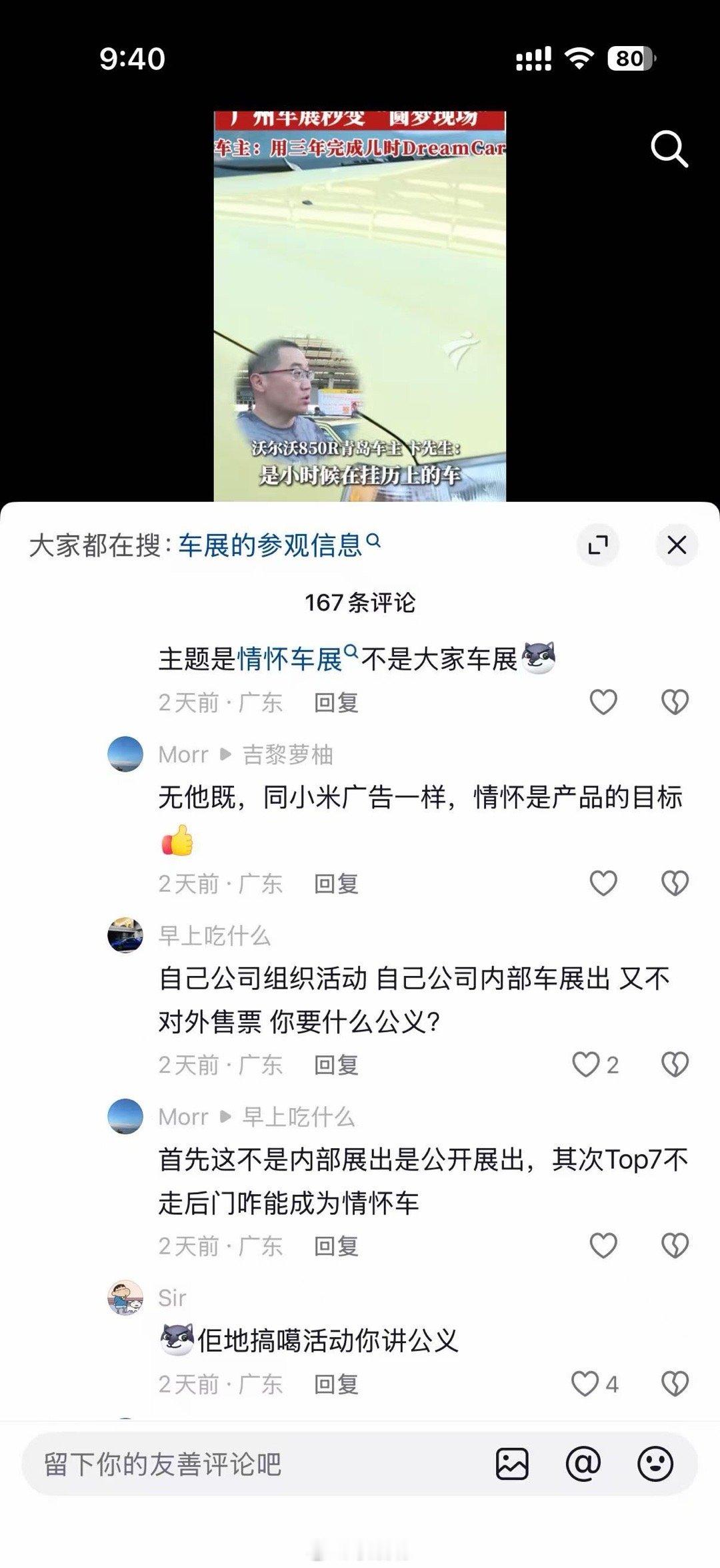 网友发了几张截图给我,有网友对情怀车展有些意见,认为TOP7无资格入选,还有一些车不够标准。我非常理解这位朋友的心情,给他带来不够好的体验,我非常抱歉,兄弟对唔嗨住但,我想补充说明一下,如大家所说,这个活动我们是免费开放的,整体超过150万成本,都是大家车负责,包括生意兴隆的柠檬茶,小吃摊位,我们都没有收取任何费用,还花了3万多替摊主拉电线做布置,目的只有一个,把活动做好,让更多车迷满意,开心。还有一个根本不需要回避的事实,虽然我们热爱汽车文化,希望全力以赴做好活动体验,但我们依然是一间正常运营的公司,在自己举办的活动上,传播我们公司的IP,作品,并且尽可能不影响大家体验的前提下,做商业合作的结合,这应该不是难以理解的商业逻辑吧? 也是全世界通行的做法。还有展车,因为场地有限,报名有500多部车,我们不可能全部照顾,我非常理解车主的心情,自己的车,一定是最好的,因为我也是这样的,但我们只能尽力而为,今年没机会入选,那我们明年约,这样不好吗? 感谢支持,感恩理解,我们明年继续约