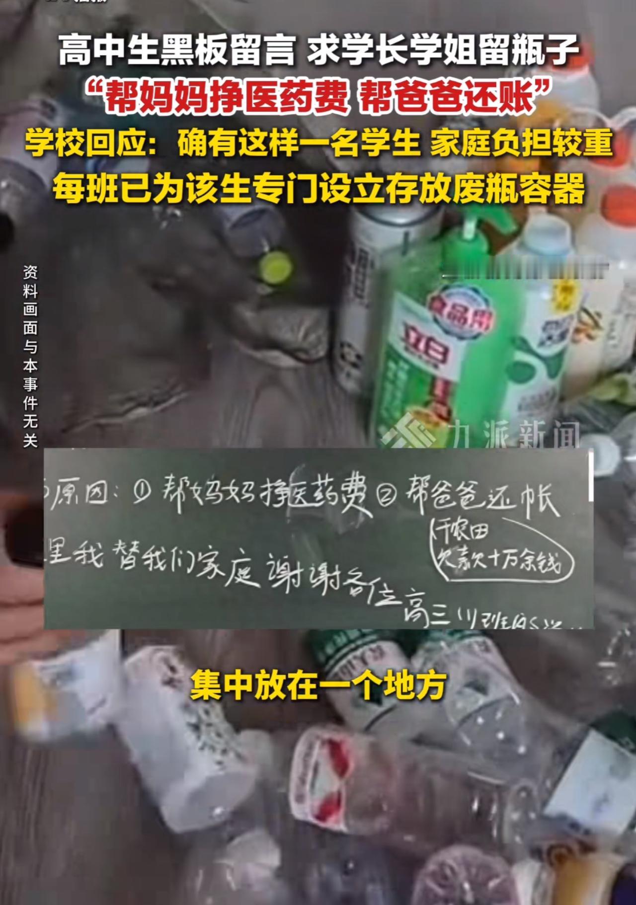 现在全网都在找这个安徽的高中生 为了母亲的医药费 为了帮父亲还10万元的农田帐,小小年纪的他,在每个教室的黑板上写下了自己的小小请求。 他想让各位学姐学长把平时剩下的塑料瓶放在固定的角落,自己每天放学去收。学校的老师和学生都在默默的帮他。 多么懂事的孩子呀。现在安徽淮南第五中学就读。 在这么早的年纪,就能放下自己的面子,撑起家里的重担,这样的孩子日后必成大器。 就凭着他的勇气和担当,将来一定是一个优秀的孩子! 如果哪位有能力的好心人看到他,请帮帮他。