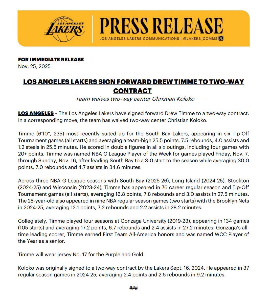湖人官方:球队用一份双向合同签下内线德鲁·蒂米并裁掉科洛克