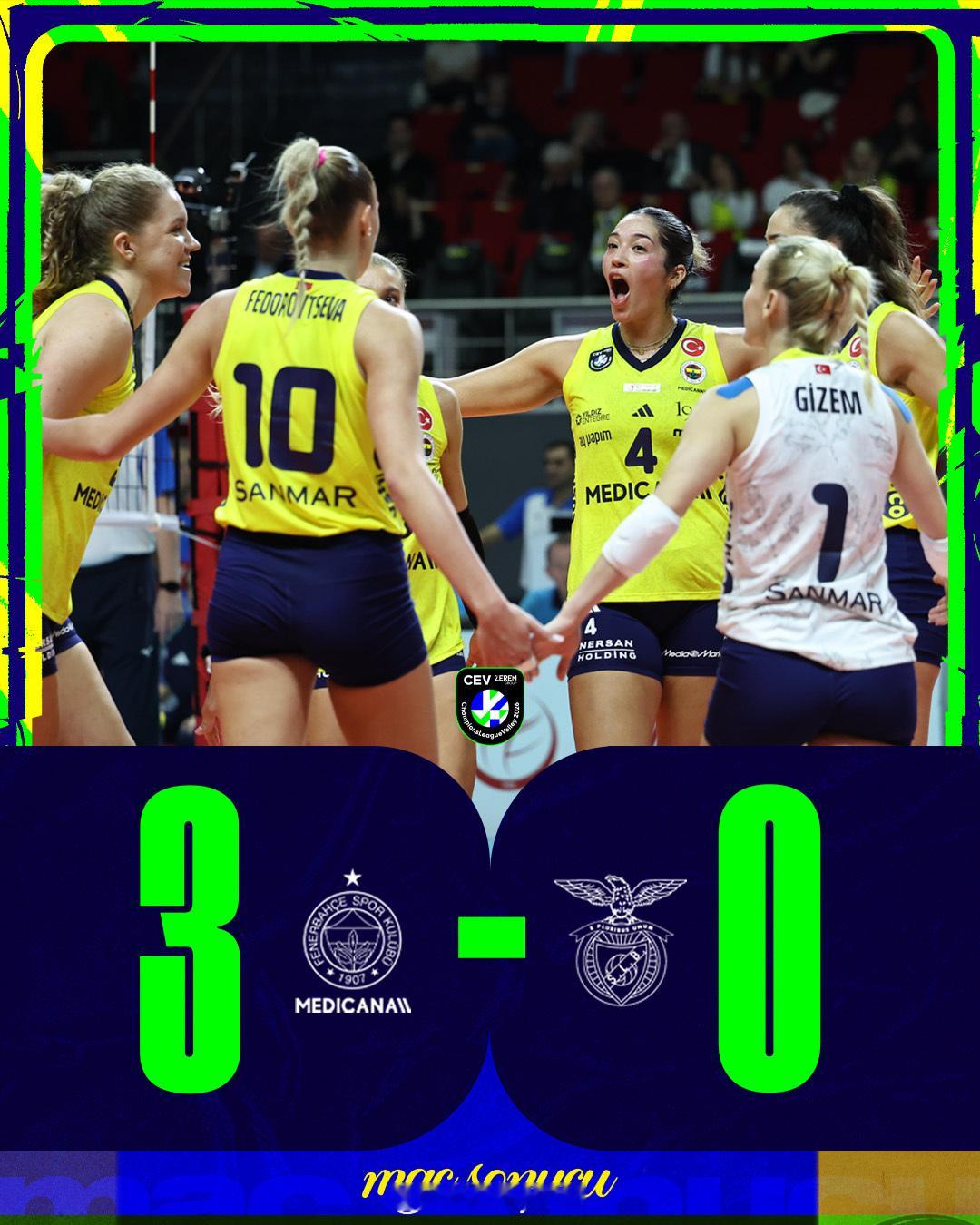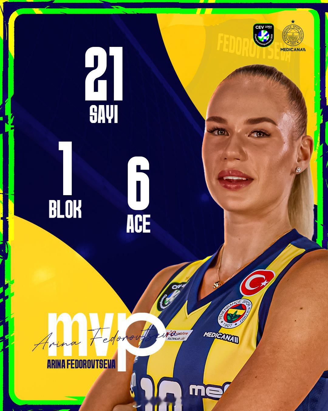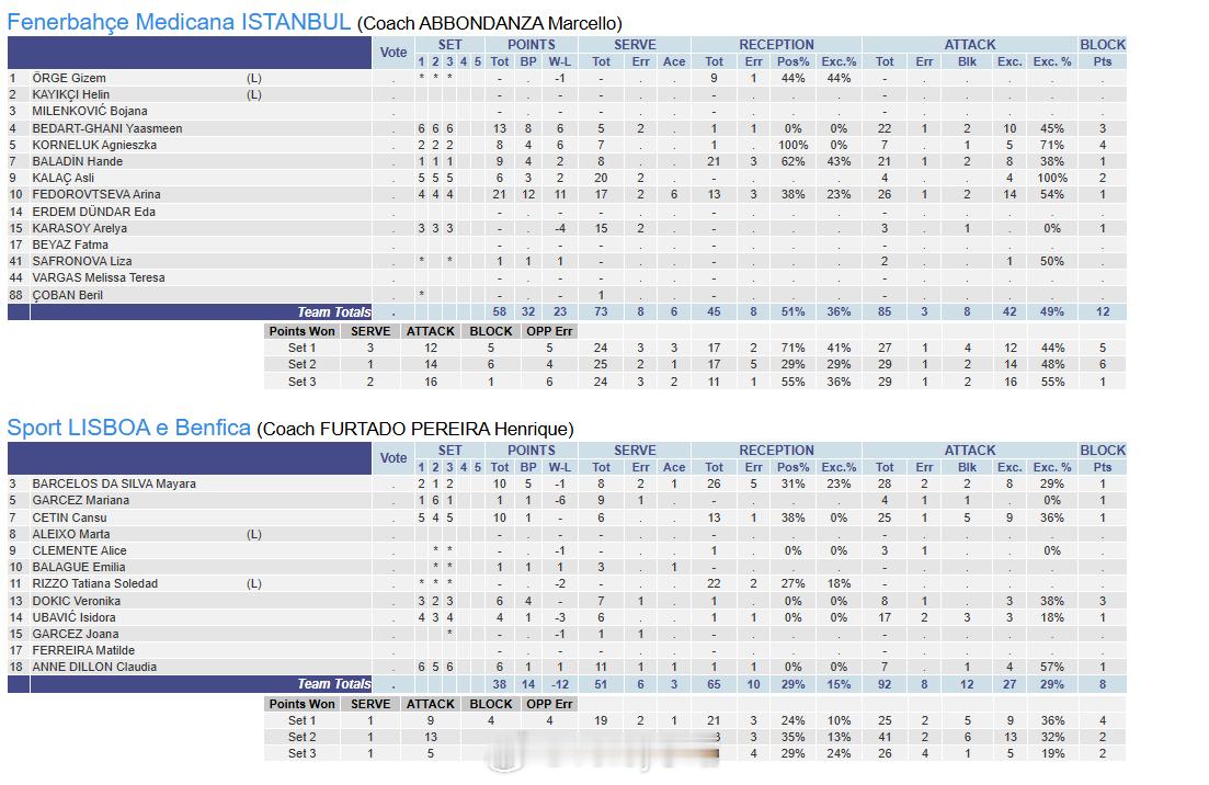2025-2026赛季女排欧冠小组赛第一轮,土耳其费内巴切3-0葡萄牙本菲卡(25-18 25-19 25-12)小彩娃21分,26扣14中,1失误2被拦,1拦6发亚瑟敏13分,22扣10中,1失误2被拦,3拦科尔内卢克9分,7扣5中,0失误1被拦,4拦巴拉丁9分,21扣8中,1失误2被拦,1拦卡拉奇6分,4扣4中,2拦巴塞洛斯10分,28扣8中,2失误2被拦,1拦1发切廷10分,25扣9中,1失误5被拦,1拦狄龙6分,7扣4中,0失误1被拦,1拦1发多基奇6分,8扣3中,1失误0被拦,3拦