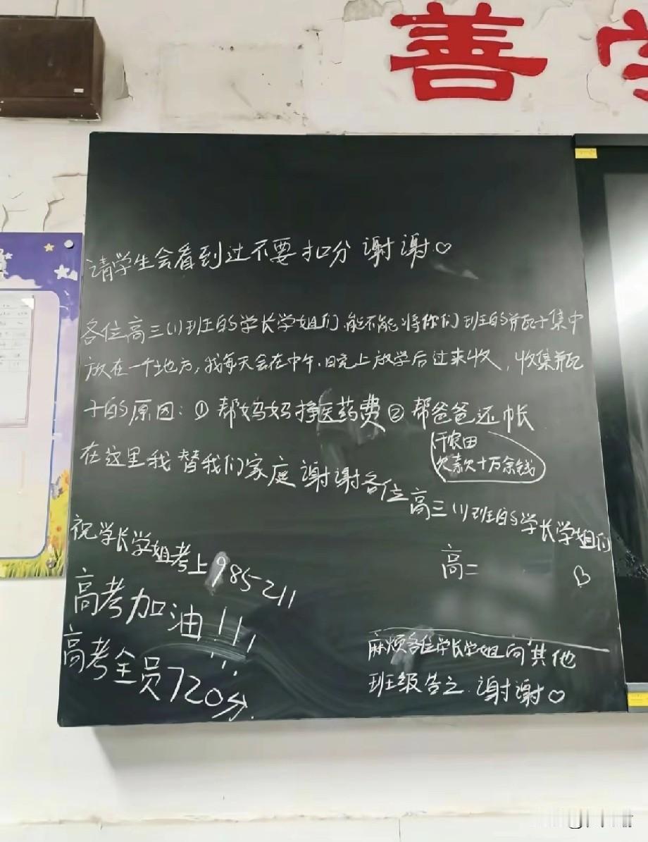 安徽,一高二男生火了!不是因为他的学习成绩有多亮眼,而是他本该专心读书的年纪,却想着帮家里分担,在学校捡瓶子换钱补贴家用。 这个男生家里遇到了难处,爸爸欠下了十多万的债,妈妈还常年要吃药看病,为了帮家里减轻负担,才决定捡瓶子。 他没有卖惨抱怨生活的艰难,没有向他人索取不劳而获的帮助,只是在黑板上坦诚地写下自己收废瓶的初衷。 其实在这之前,他就已经背着编织袋,每天放学后趁着同学们都走了,从一楼跑到五楼,挨个教室问有没有瓶子。只是这样收集太麻烦,效率也不高,才写下黑板留言。 学校老师说,这个学生平时话不多,遵守纪律,就是家庭负担太重,才选择用这种方式帮家里解决问题。 现在学校已经帮他协调好了集中收集的方式,每个班级都摆上了纸箱存放空瓶,他只需要在放学的时候,去各个班级取就行。 很多网友看了这段留言都被打动,说这个男生敢直面困难,还不卑不亢,比很多成年人都勇敢。每个瓶子都是他对家庭的责任,懂事得让人心疼。 男生没有靠博眼球的操作,没有卖惨哭诉,而是用最朴实的方式,既扛起了家庭责任,又守住了自己的体面,这份懂事和担当,真的远超同龄人。 愿这个懂事的少年能被生活温柔以待,也愿这份质朴的善意能一直传递下去,温暖更多人。
