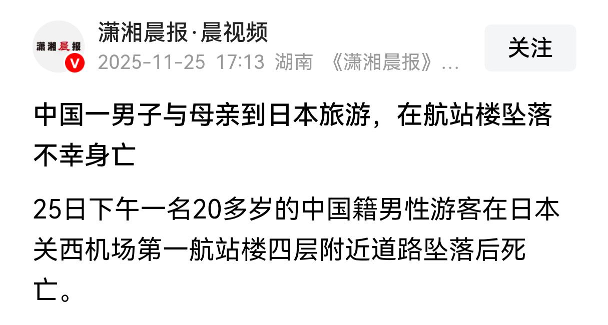 中国男子日本坠亡,不理解但尊重 近期一名20多岁的中国籍男性游客在日本不幸发生坠亡。根据相关媒体发布的消息可以得知,此人是近期和母亲等人来日本旅游的。 目前我国和日本之间的关系持续紧张,我国也已经向全体公民发出消息,近段时间最好不要去日本。一方面是为了反制日本首相高市早苗的涉台言论,另外一方面是日本社会的治安不好,频繁发生针对华人的案件,并且有很多案件一直到现在为止都没有侦破。 祖国已经说的很明确了,这个时候还是顶风而上,去日本旅游,对于这种行为,我个人不理解。但是尊重,毕竟都是成年人,都应该为自己的行为负责,死走逃亡都是自己的选择。