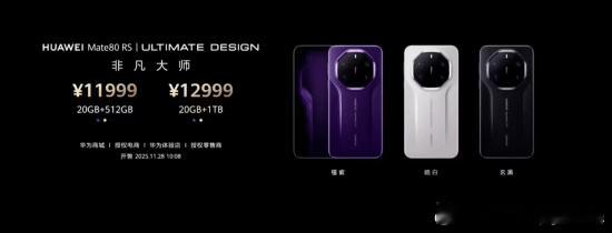 华为Mate80RS非凡大师:独享20GB内存 11999元起日前华为 Mate80 RS 非凡大师手机正式发布。该机是 Mate80 系列独享 20GB 内存的一款机型,提供 512GB/1TB 两种存储空间,售价分别为 11999/12999 元,将于 11 月 28 日上午 10:08 开售。新机采用“双面昆仑”,配有第二代昆仑玻璃后盖和第三代玄武钢化昆仑玻璃屏幕。同时,该机实现业界首发 BD.2022 色域双层 OLED,相比 P3 色域,覆盖提升 30%。该机支持双实体卡 + 双 eSIM 组合,支持户外探索模式、3D ToF 人脸支付和星盾安全架构。据了解,“户外探索模式”可为该机带来 14 天极限续航。影像方面,该机配有第二代红枫原色影像,搭载 17.5EV 超高动态主摄 +4x 光学微距长焦 +6.2x 光学超长焦 +12.4x 光学品质变焦镜头。