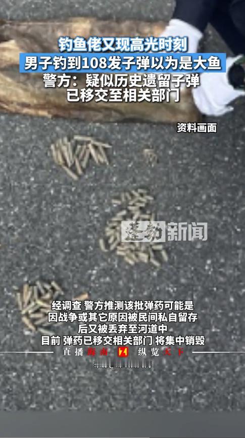 “解释不清了!”近日,江西吉安,一男在河边钓鱼时,发现鱼竿变得异常沉重,本以为钓上了大鱼,不料竟是一个白色编织袋,男子好奇的打开看了下,结果被吓得冷汗直冒,因为袋子里装的是子弹!网友:钓鱼佬果然除了鱼什么都能钓到! 钓鱼是一项非常休闲的运动,而且没有年龄和性别的限制,很多人都喜欢在没事的时候,在河边挥上几杆,享受这其中的乐趣。但如果钓上来了不明物体,那可要及时报备了。 据媒体11月24日的报道,当时男子如往常般到河边钓鱼,他找好位置后就开始调饵料,随后开始了垂钓。 一上午的时间,男子并没有钓到多少鱼,这让他不免有些失望,可就在他收竿时,鱼竿却变得异常沉重,仿佛有条大鱼上钩了! 男子强忍内心的激动,努力将“大鱼”拖上岸,结果却发现是个编织袋,而且在岁月的冲刷下,已经变得破败不堪。 男子开了道缝,往袋子里看了看,结果却发现里面装着的竟是子弹!这可把他吓坏了,立马跑出八丈远报了警。 警方很快赶往现场,经鉴定,这确实是手枪和步枪的子弹,一共有108发,推测是历史遗留下来的,然后被人扔到了河中,随后警方又在周围展开详细的搜寻,并没有发现其他危险品,于是将子弹带回去集中处理。 所有钓鱼佬都要向这名男子学习,发现不明物体后要及时报警,这样才能保障安全,毕竟专业的事要交给专业的人去做! 信息来源:《男子钓鱼竟钓到108发子弹钓鱼佬又现高光时刻,男子钓到108发子弹以为是大鱼。警方:疑似历史遗留子弹,已移交至相关部门。》蓬勃新闻