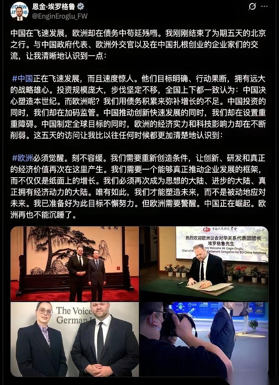 欧洲议会议员恩金·埃罗格鲁:“欧洲不能再睡了!” 这一幕的似曾相识感,令人想起一百多年前李鸿章访问欧洲时的复杂心境——他目睹西方工业强盛,反观清廷积弊,内心充满了震撼与焦灼。 而仅仅只是百年流转,如今形势已然逆转。今日欧洲面临增长乏力、官僚体系效率低下及战略自主性不足等“垂垂老矣”的困境;反观中国,则以高效的基础设施建设、清晰的战略规划和蓬勃的创新活力,展现出“奔赴星辰大海”的敢闯敢拼之势。 斗转星移,沧海桑田,相信我们会让他们重新如历史长河里那般仰望、羡慕!