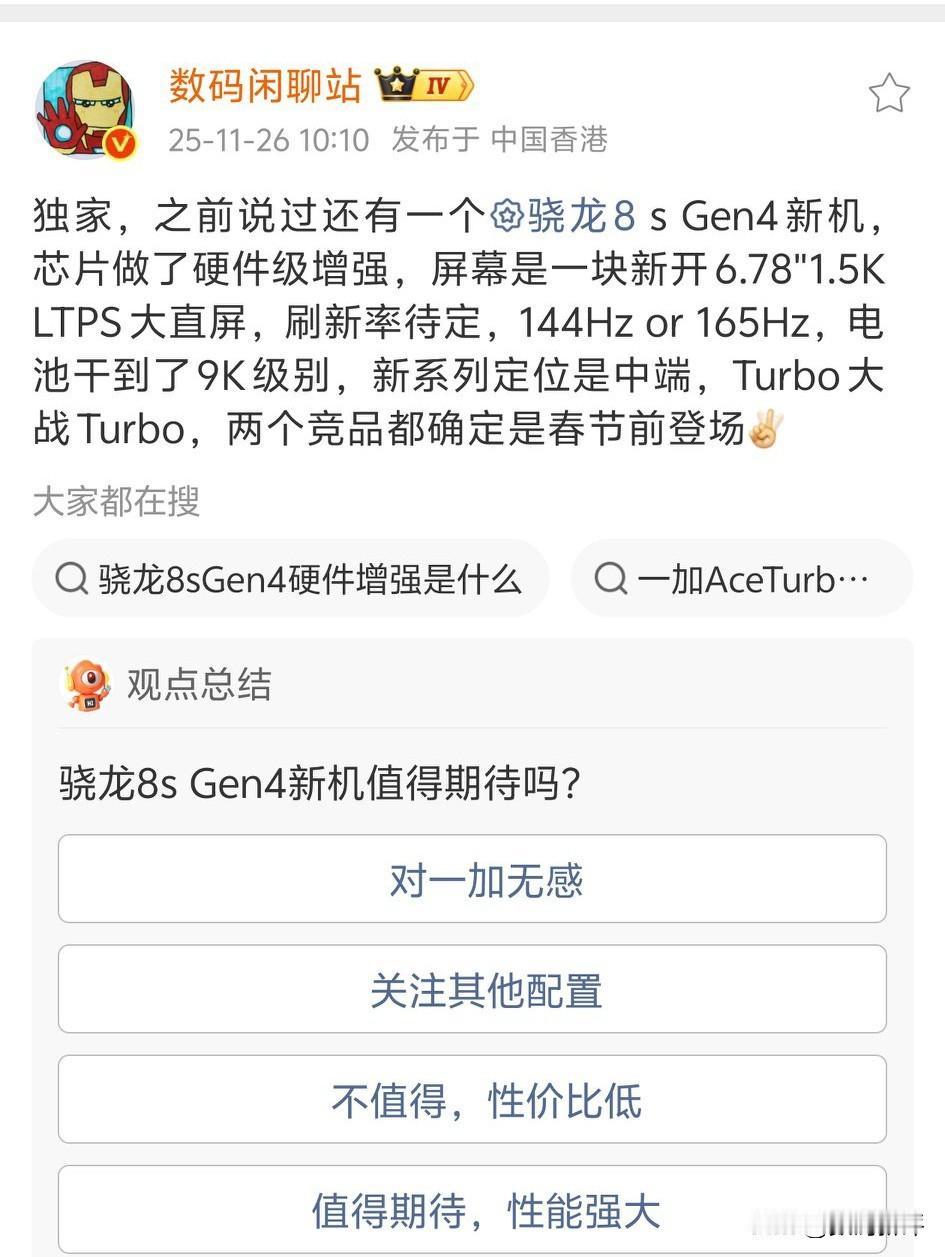 一加的turbo机型也快来了!骁龙8sGen4处理器,9K毫安大电池,超高刷新率,对标红米turbo5标准版,都是春节前发布,一加是电池更大,红米是性能更强,感觉一加turbo机型不会给金属边框[思考]首款机型配置不能给太满了[灵光一闪]一加的机型越来越多了