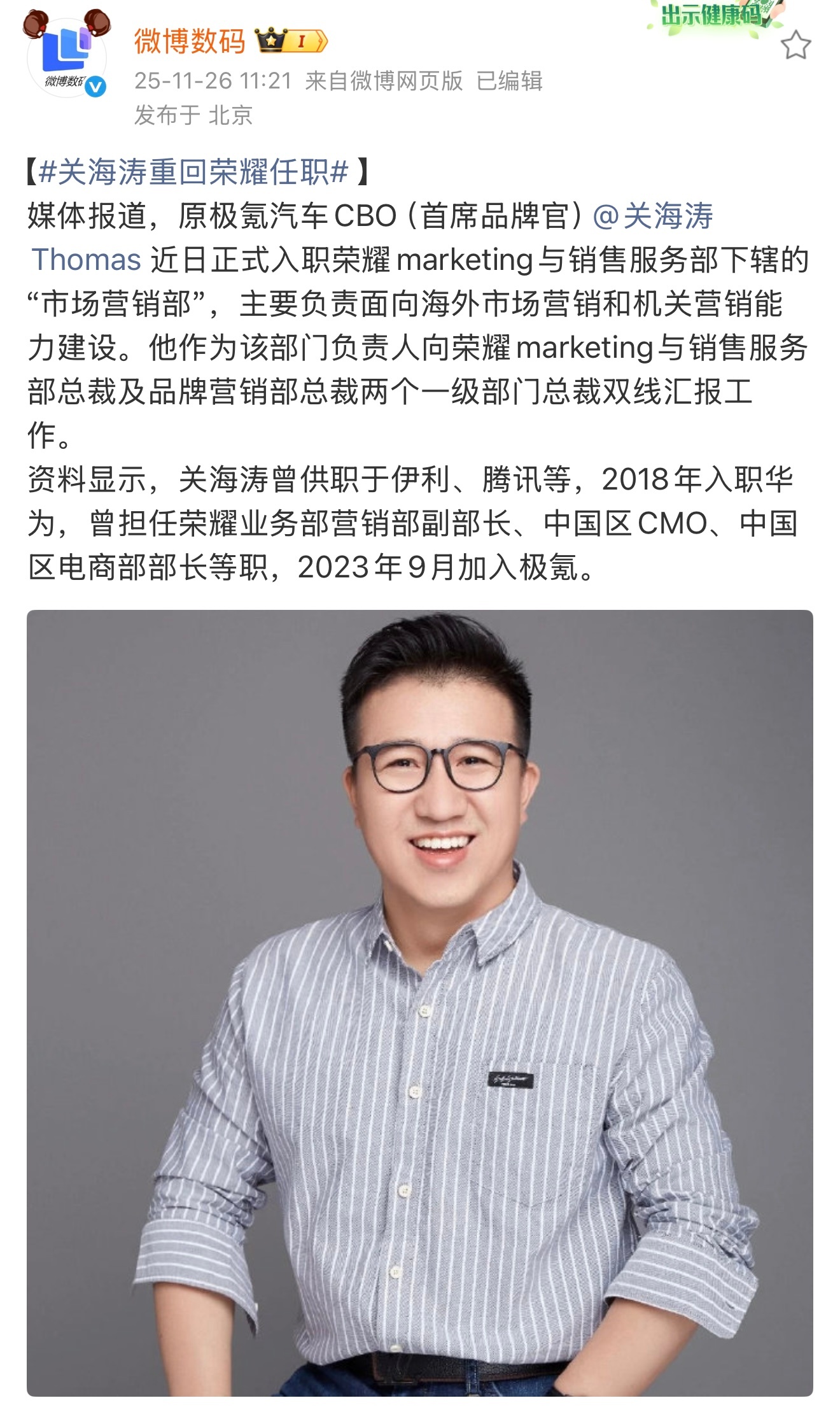 关海涛重回荣耀任职2018年那会荣耀还在华为,绕了一圈涛哥从极氪汽车离开重回荣耀,都说 车&机 不分家,重回来是好事!